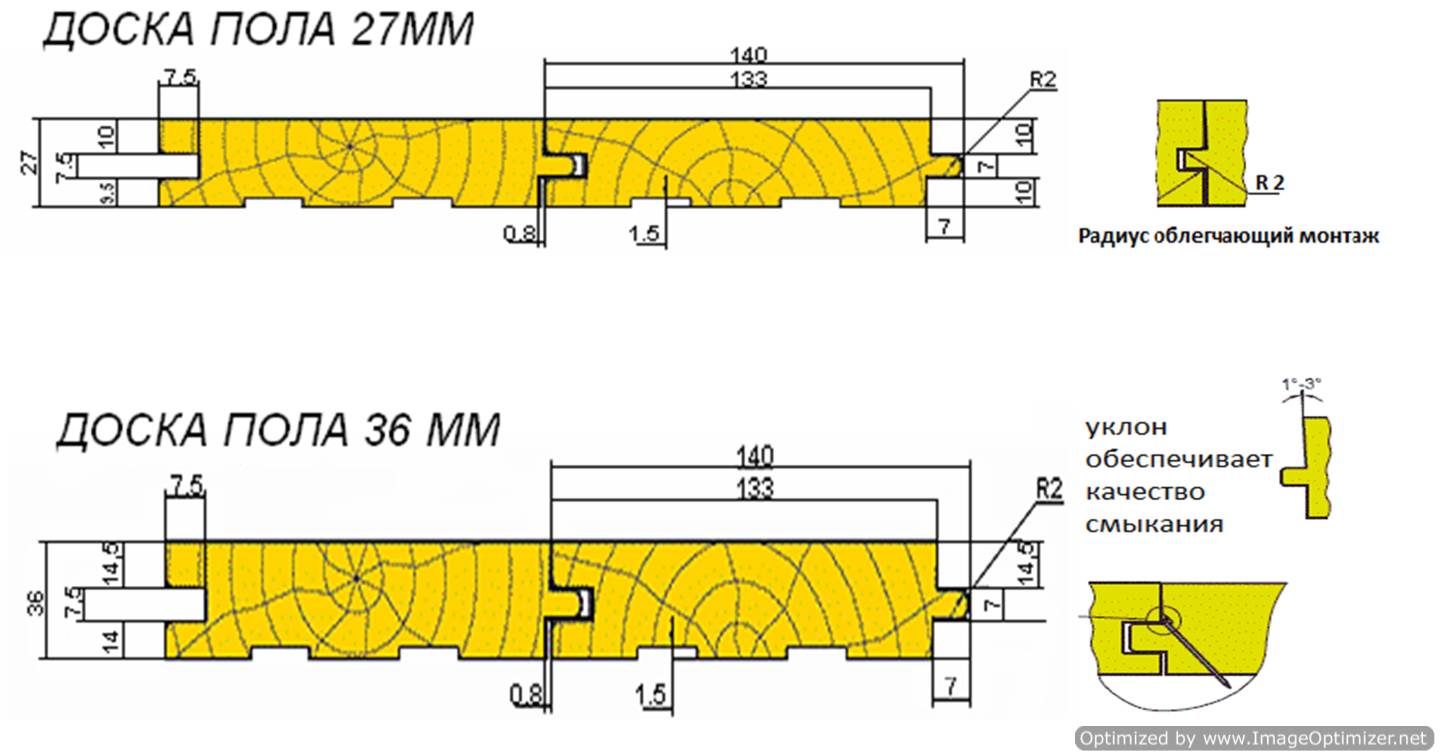 Les longueurs habituelles sont 300 et 600 cm, mais si vous préférez, vous pouvez acheter une planche de 4 ou 5 mètres de long, mais des modèles légèrement inférieurs en longueur à la pièce sont préférables. On trouve souvent en vente des produits rainurés d’une épaisseur de 21, 35, 50 mm. Rappelez-vous que pour la fabrication de sols applicable couvre uniquement pas plus mince que 2,7 cm (En outre, la valeur minimale ne convient que pour les locaux commerciaux et l'utilisation d'un revêtement de 3,5 cm dans le salon est justifiée).