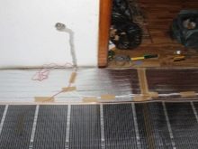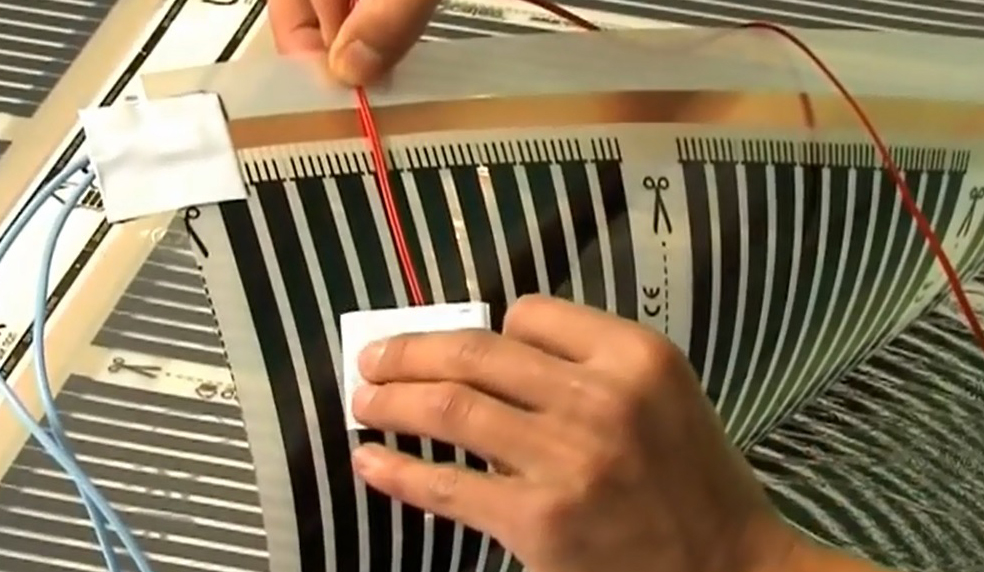 - Il est nécessaire de poser les éléments chauffants à film infrarouge. En outre, les bords sont fixés avec du ruban adhésif afin qu'il n'y ait pas de changements. Les bandes doivent être placées de manière à ce que les contacts soient plus proches du thermostat.
