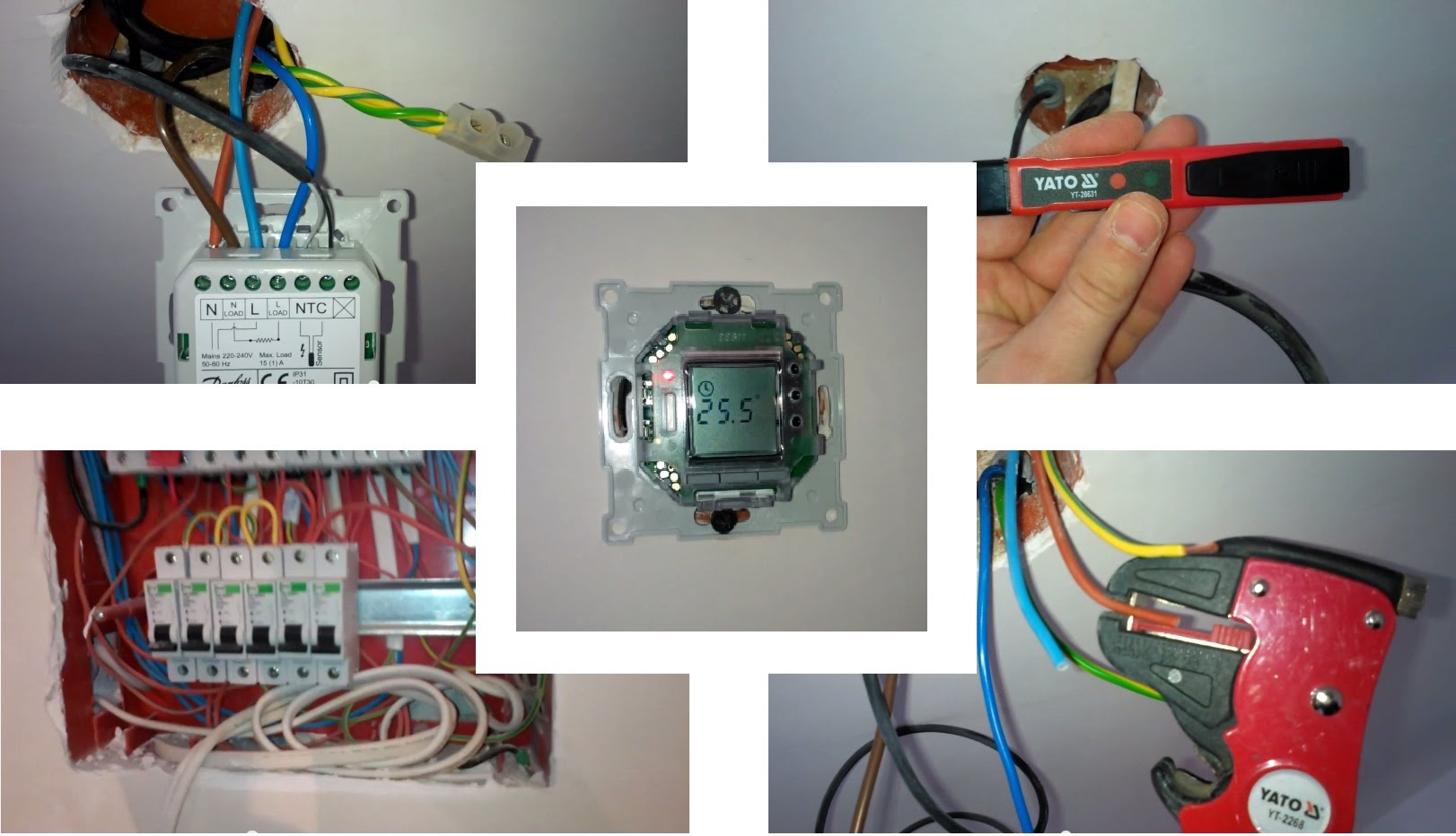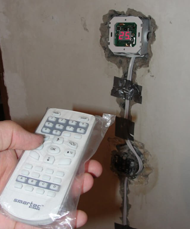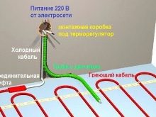 - Vous devez d’abord installer une boîte de jonction avec un thermostat. Un mur est coupé dans le mur pour connecter le film et le capteur au thermostat. Nous conduisons le câble d'alimentation à la boîte de jonction.