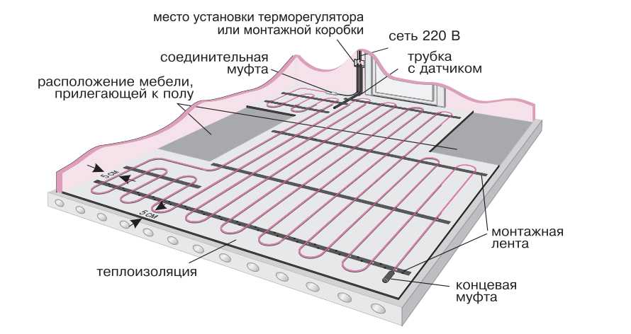 - Le ruban de montage est installé et le câble est posé avec le pas nécessaire. L’extrémité du fil de câble est transmise à la boîte de jonction où le thermostat sera situé.