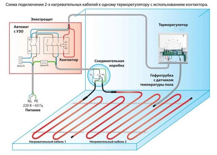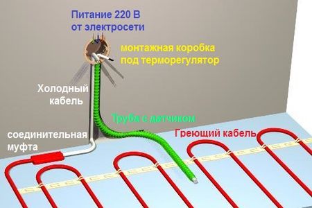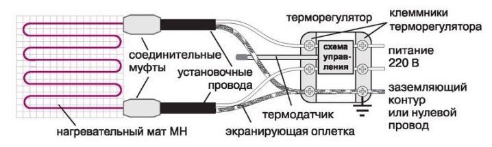Selon le modèle de plancher électrique utilisé comme chauffage, les schémas de câblage diffèrent. Connecter un ETP est beaucoup plus facile que de connecter un plancher d’eau. Aucune connexion supplémentaire n'est requise (par exemple, sur la chaudière électrique), mais uniquement sur le réseau électrique.