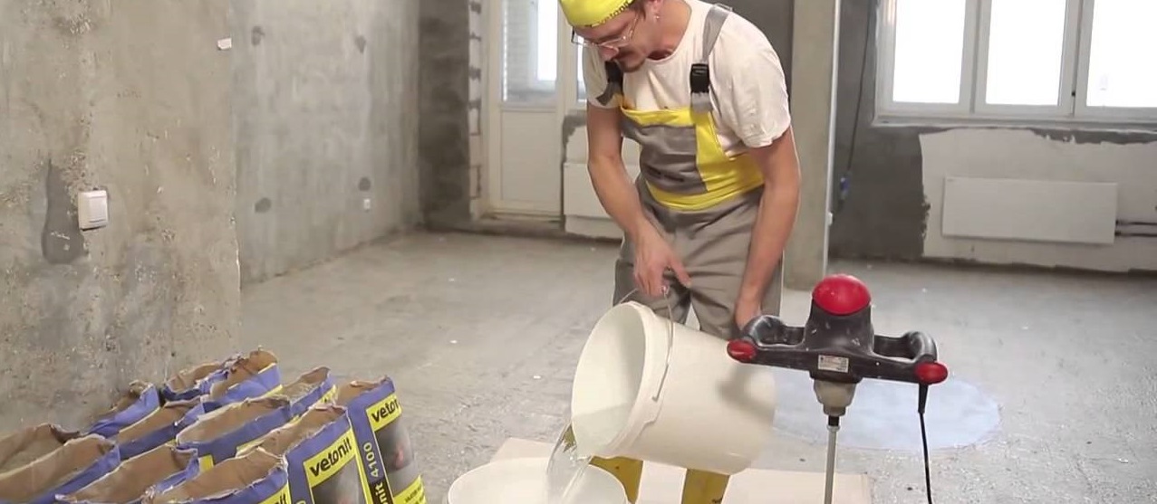 La température optimale dans la pièce où se déroule le processus de pose doit être de 10 à 25 degrés Celsius au dessus de zéro. Il ne devrait y avoir aucun courant d'air dans la pièce, donc les portes et les fenêtres devraient être bien fermées. Pour diluer la poudre, utilisez de l'eau pure. La composition est mélangée à l'aide d'une perceuse avec une buse spéciale.