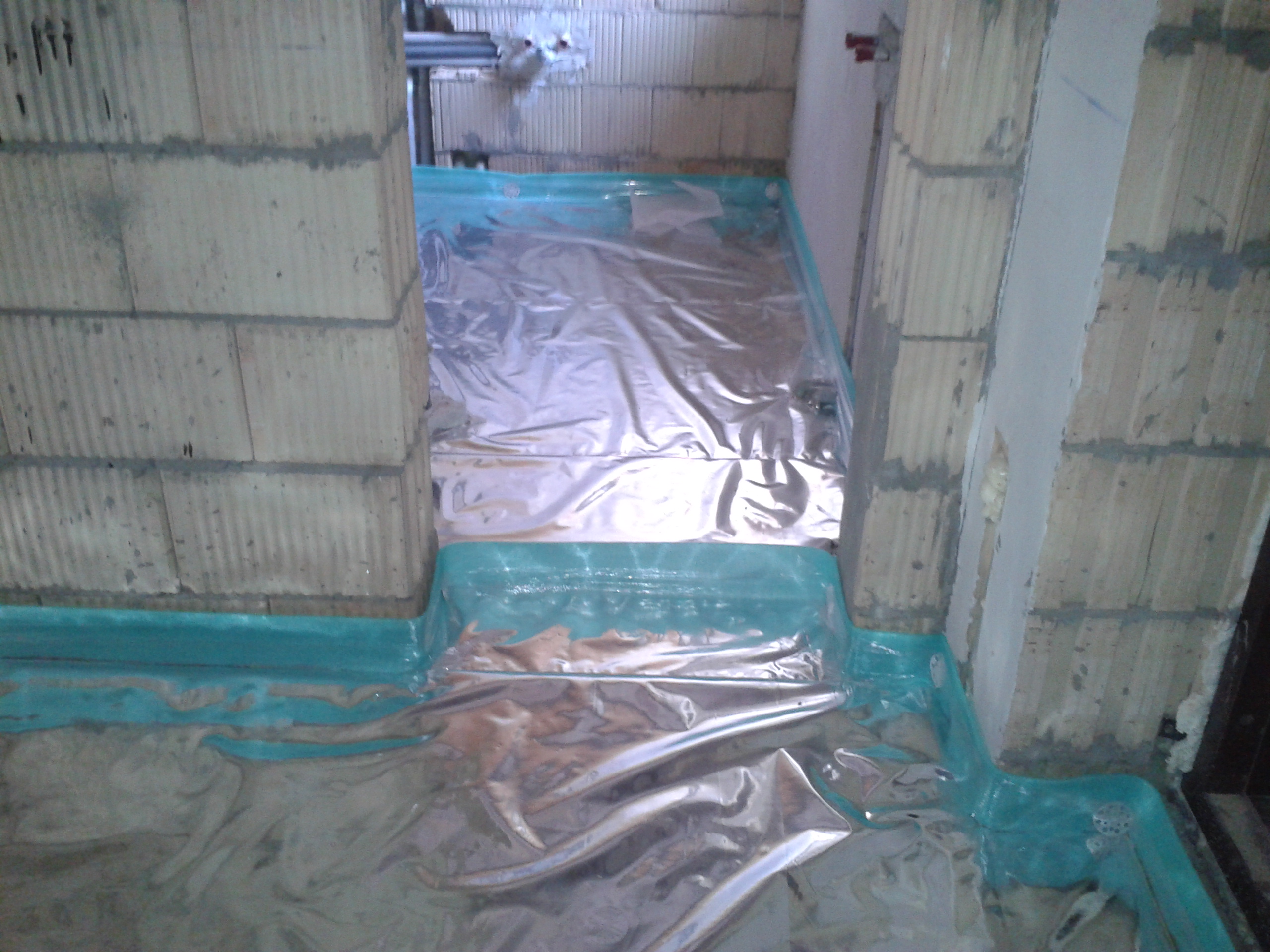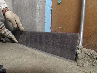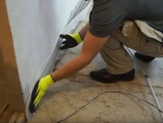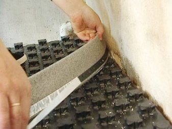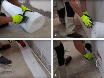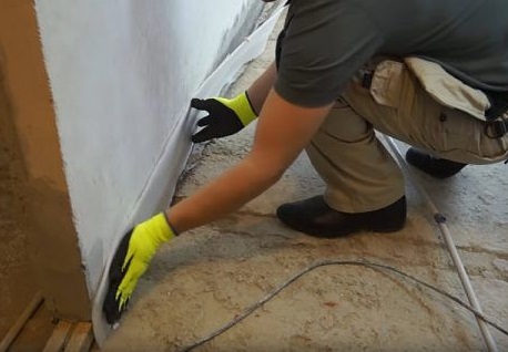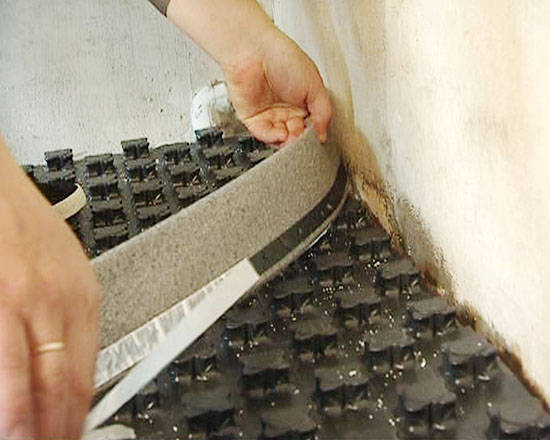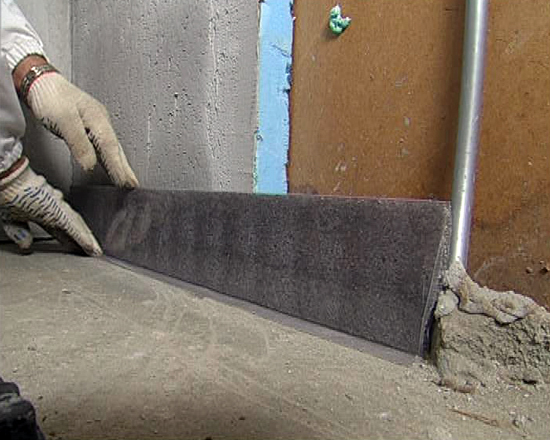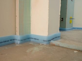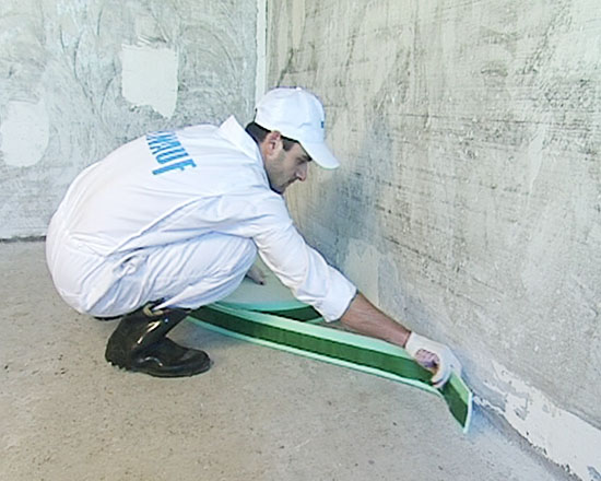 S'il y a une couche adhésive sur le ruban, il suffit de l'appuyer avec un côté adhésif sur le mur tout autour du périmètre de la pièce. Option avec une "jupe", pliée au sol pour de sorte qu'aucun liquide (humidité) ne puisse y pénétrer.