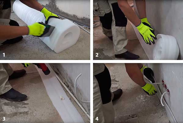 - La pose de polyéthylène expansé ne crée pas de vide. La pièce doit être entièrement collée autour du périmètre. Il est également indésirable de faire des joints fréquents à partir des segments.