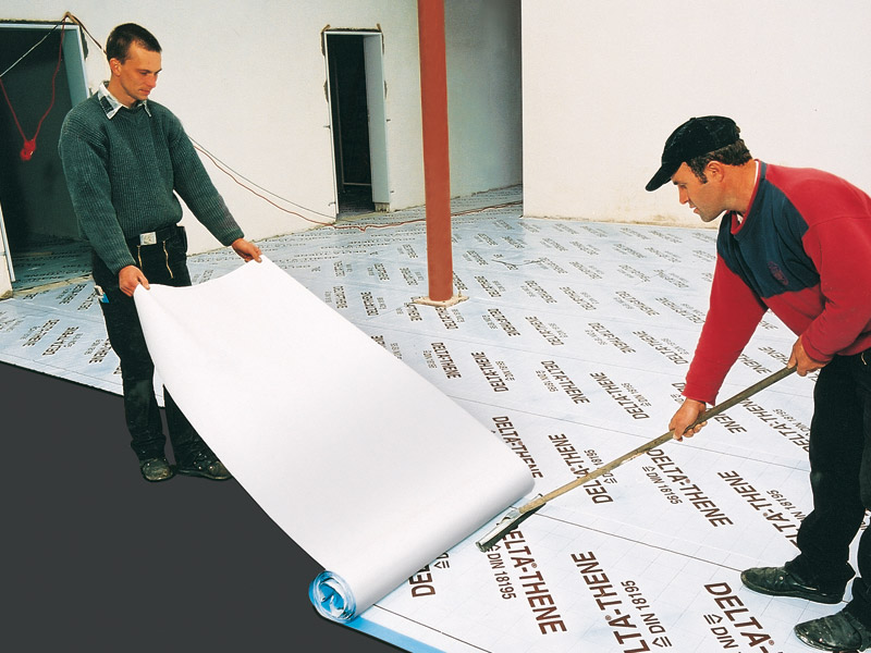- Pour la pose de l'isolant en rouleau après le nettoyage de la base, il faut appliquer les marquages. Tous les revêtements sont appliqués avec une largeur de recouvrement d'environ 5 cm. En outre, en fonction du type d'hydroprotection, les zones sont soudées les unes aux autres, collées par chauffage avec un sèche-cheveux du bâtiment, fixées ou utilisées avec des feuilles autocollantes. Après l'installation, vous pouvez procéder immédiatement à la chape sèche ou humide de l'appareil.