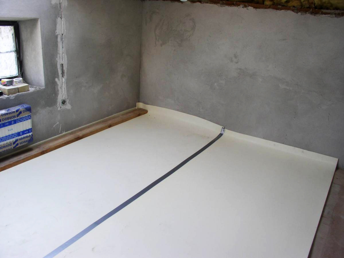 Il est possible d'appliquer des enduits à base de mastic ou laminés à la fois sous chape semi-sèche et liquide. Il est nécessaire de vérifier que tous les joints de la couche isolante, le cas échéant, sont traités et collés de manière fiable.