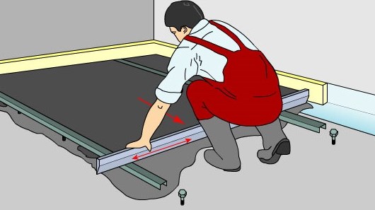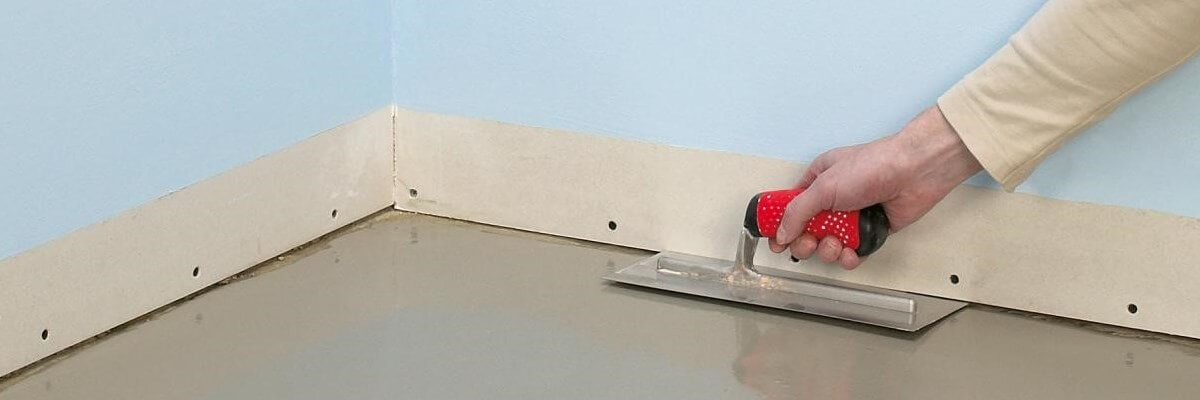 - Le processus de coulée se fait par bandes afin de contrôler en permanence la régularité de la zone où le mélange existe déjà. Les balises installées servent de coffrage. La surface doit être aplatie par la règle. La solution peut être fournie à la truelle ou à la pelle, en fonction de la pièce et de l’ampleur des travaux.
