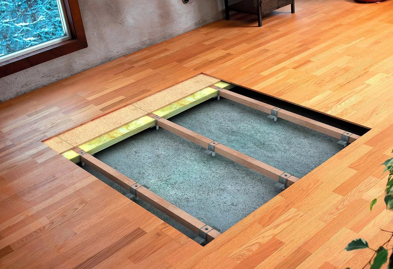 Pour obtenir le résultat souhaité, un matériau insonorisant doit être placé entre les lattes et les poutres de plancher. Il n’est pas nécessaire de fixer les barres latérales aux poutres, car elles doivent reposer librement sur le sol.