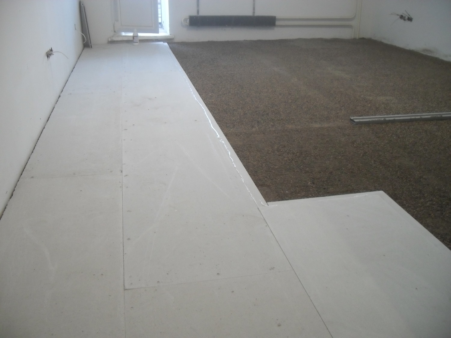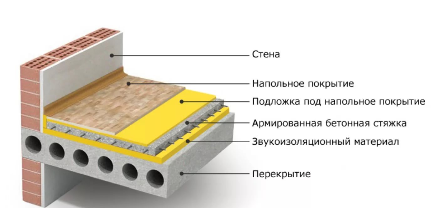 Bien avec la tâche d'absorption acoustique fait face à la double couche protectrice. Le système consiste en un remblai sur lequel sont posées deux couches de PRP. La deuxième couche est posée avec un léger décalage afin que les coutures ne coïncident pas. L'épaisseur de la structure est d'environ 4 cm, de sorte que la pièce ne perde pas en hauteur.