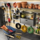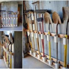 - Conteneurs de tuyaux. Les gros outils, tels que les outils de jardin, peuvent être rangés dans des tuyaux en PVC spécialement coupés. Pour créer un conteneur pratique et multifonctionnel, il suffit de couper le tuyau en plusieurs parties égales et de les fixer au mur. En fonction du diamètre, plusieurs outils s'intègrent dans un tuyau à la fois.