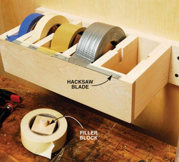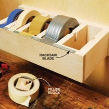 - Conteneur pour les bandes. Le ruban isolant est une autre chose qui devrait toujours être à portée de main. Afin de ne perdre aucun écheveau, vous pouvez retirer un simple conteneur des planches pour le stocker. Il est très pratique de placer chaque bande dans un compartiment spécial.