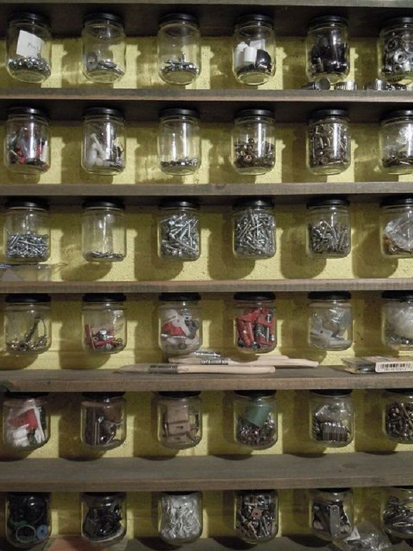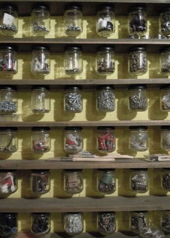 - Boîtes suspendues. En plus du support magnétique, des bidons avec des couvercles dévissés peuvent être utilisés pour stocker les détails nécessaires au travail. Les couvercles sont fixés au bas des étagères et dans les banques, des vis autotaraudeuses, des clous, des vis, etc.
