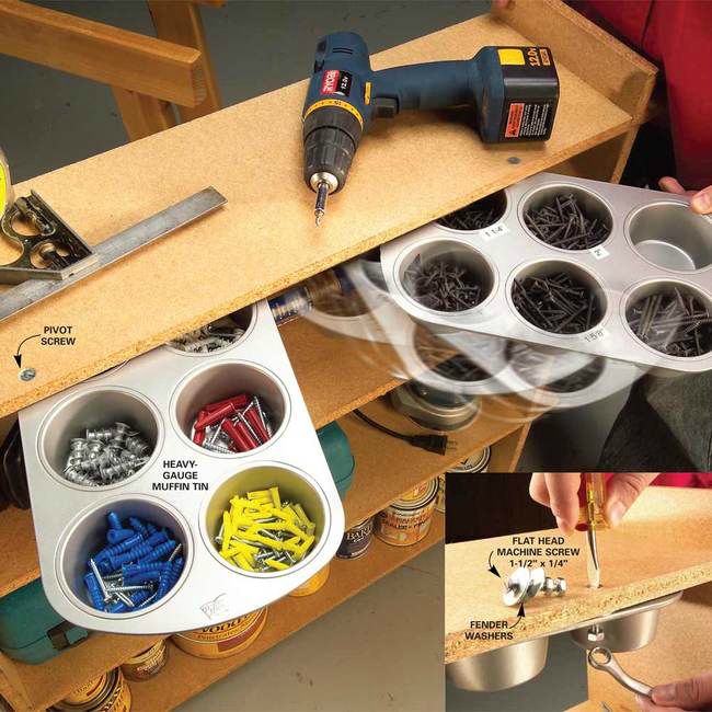 - Formes de cupcakes. Les moules à gâteaux sont une autre chose qui n’est pas évidente et que l’on trouve dans le garage d’un passionné de voitures. Ici, ils ne sont pas utilisés aux fins pour lesquelles ils ont été conçus, mais tous pour le même stockage de petits écrous, fixations et vis. Ceci est pratique car vous pouvez placer des fixations de différentes tailles dans chaque moule, en les triant ainsi.