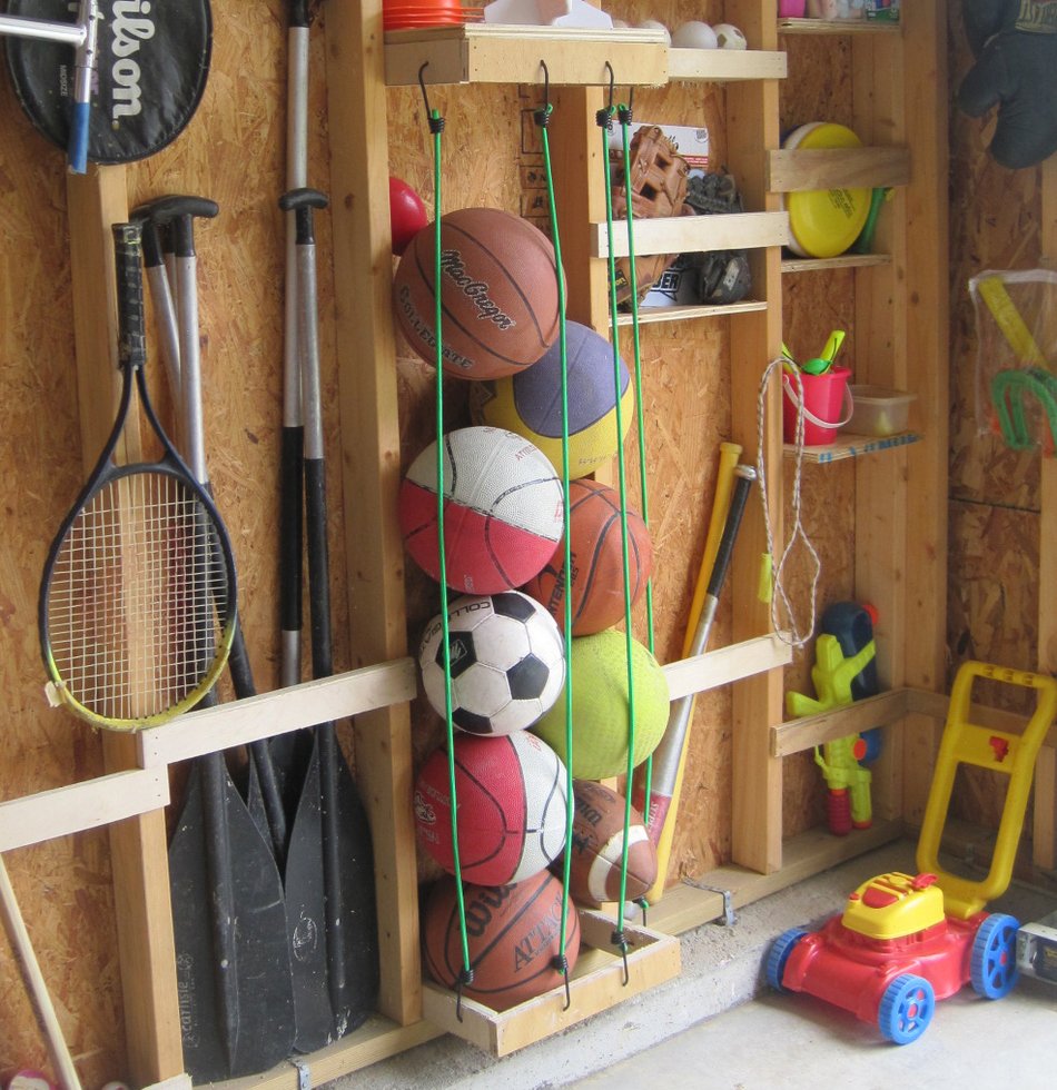 - Organisation d'équipements sportifs. Ceux qui mènent une vie active doivent rester à la maison et même des équipements sportifs. Pour que les balles ne roulent pas autour du garage, vous pouvez tirer deux cordes solides de la largeur souhaitée et les fixer au sol et au plafond.Il s’avère être un compartiment fait maison pour ranger les accessoires de football, de basket et de volley. Les balles à partir de là ne se dérouleront pas, mais vous pouvez en avoir une qui est nécessaire maintenant sans aucun problème.