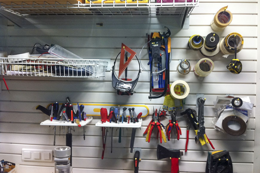 - Panneaux de contreplaqué pour stockage vertical. Si vous percez quelques trous différents dans du contreplaqué ordinaire, vous pourrez y ranger des outils: tournevis, pinces, clés, etc.d.