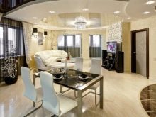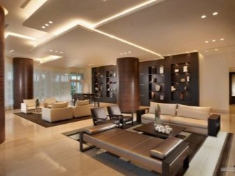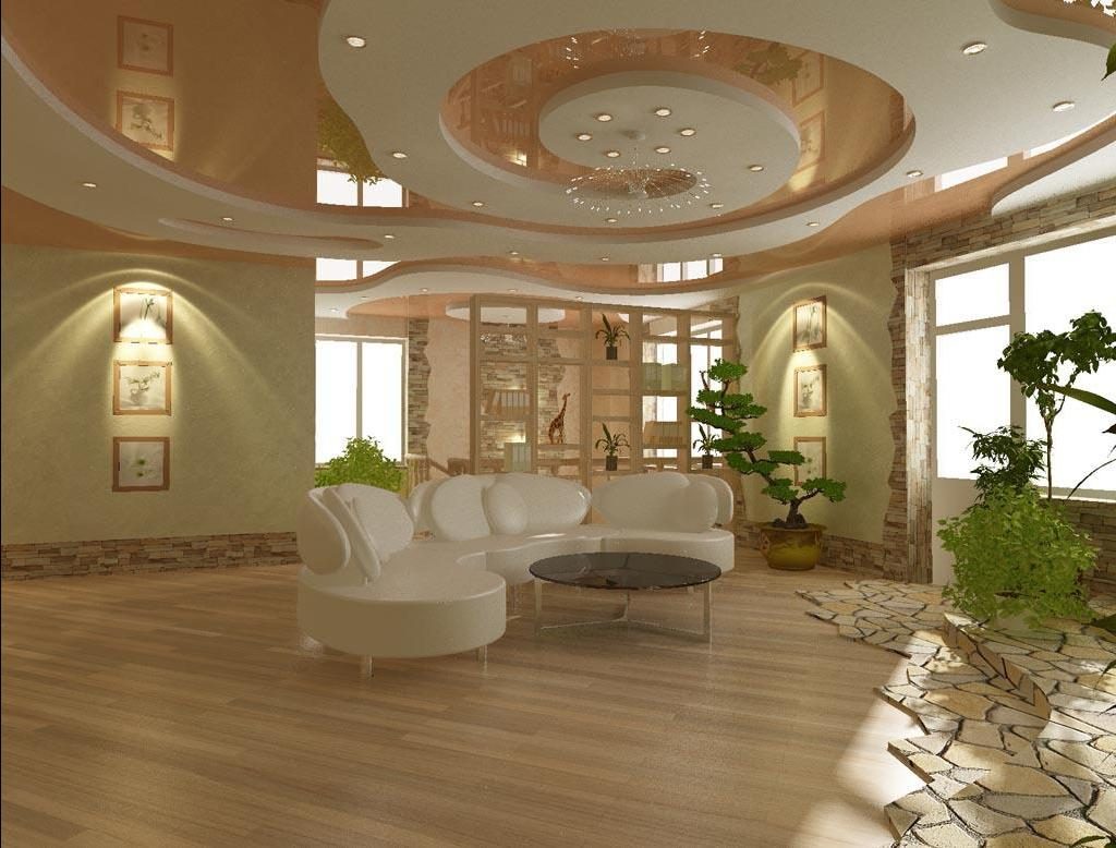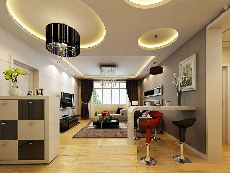 - Salle de séjour. Plafonds bouclés au look original et insolite dans le salon. Cette salle est considérée comme l'endroit idéal pour les décisions de conception les plus courageuses et les plus extraordinaires.
