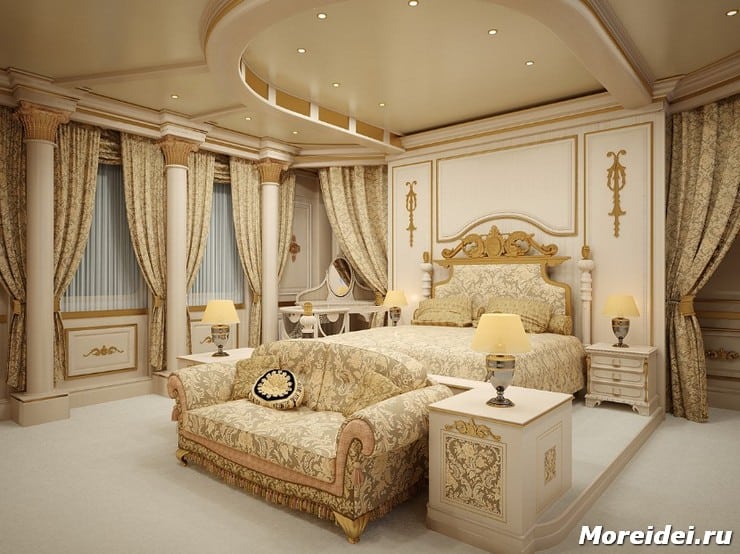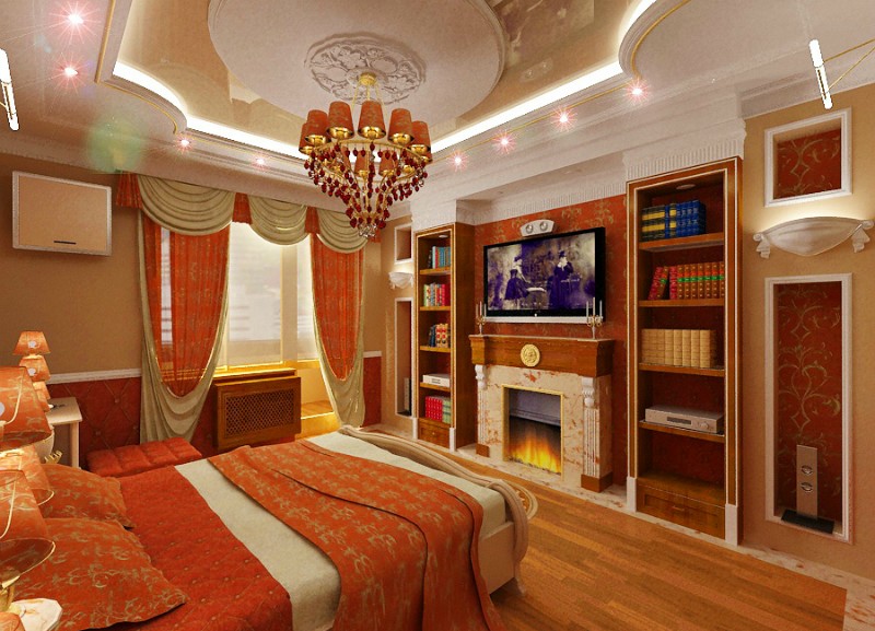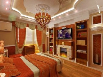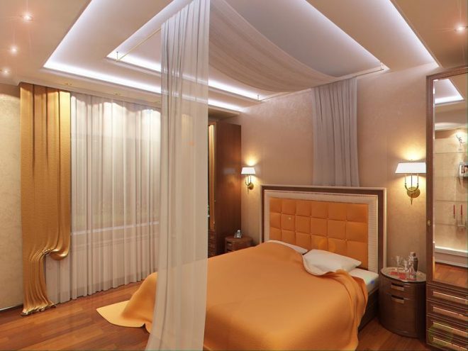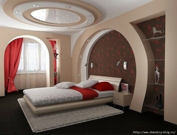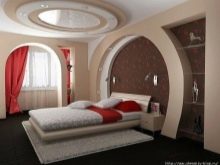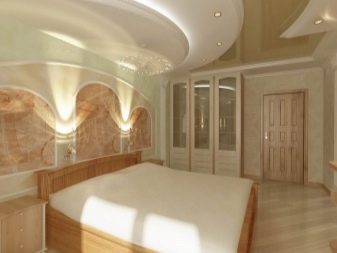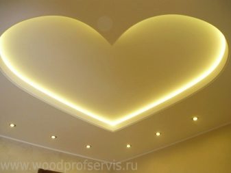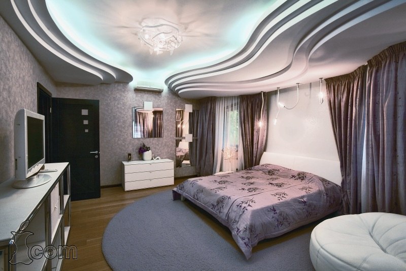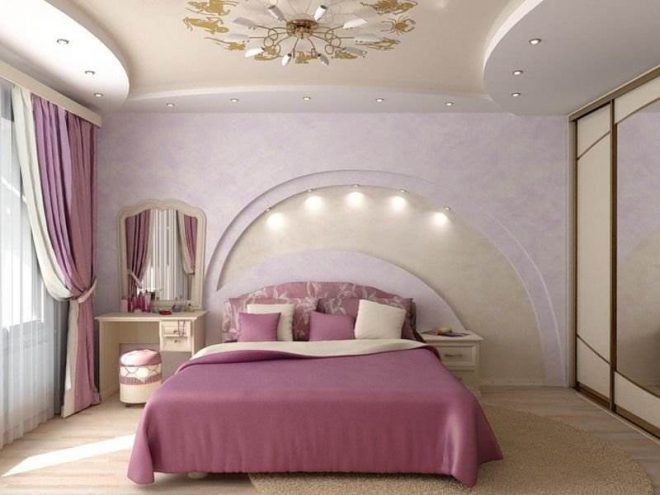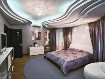 Les dessins bouclés au plafond sous forme de lignes ondulées et lisses rendent la chambre plus élégante et plus attrayante. Ici aussi, il est important d'utiliser différentes formes géométriques.Une telle conception ne perd pas de sa pertinence depuis de nombreuses années et est considérée comme l'une des plus recherchées. Une touche de romantisme donnera au plafond la forme d'un cœur avec un éclairage inhabituel, propice au repos et à la détente.