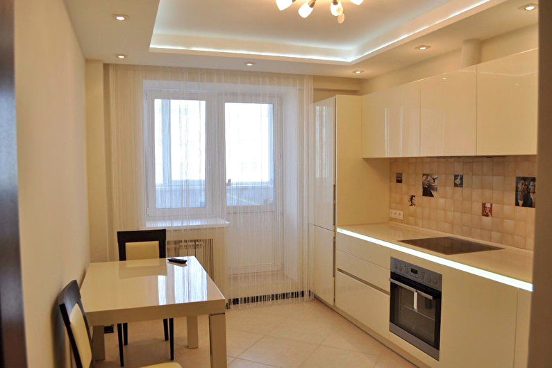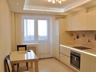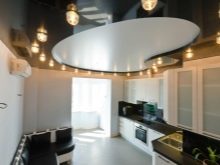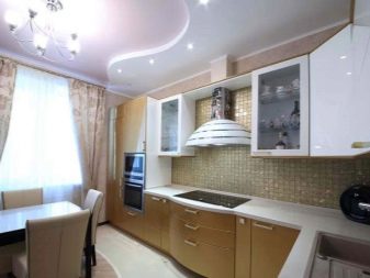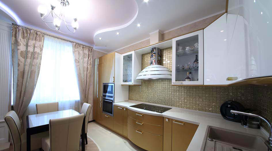 - Cuisine. Avec l'aide du plafond figuré, la cuisine peut être rendue non seulement fonctionnelle, mais aussi belle.Il est recommandé de faire un choix en faveur des options classiques, dont la gamme surprend par sa diversité. La palette de couleurs doit être choisie en fonction de la couleur du meuble et du sol. Le nombre minimum d'éléments décoratifs est la clé pour créer une cuisine véritablement pratique et esthétique.
