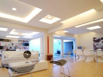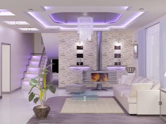 Le type et la couleur de l'éclairage sont choisis en fonction des caractéristiques de la construction en cloison sèche et de la fonction de la pièce. Il peut s'agir d'un lustre ordinaire ou de projecteurs, complétés par un éclairage LED.