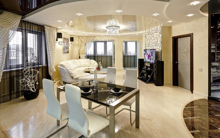 - La capacité d'élargir visuellement l'espace. Un modèle particulier du plafond figuré permet non seulement d'agrandir visuellement le territoire, mais également de diviser une pièce ou une pièce en plusieurs zones.