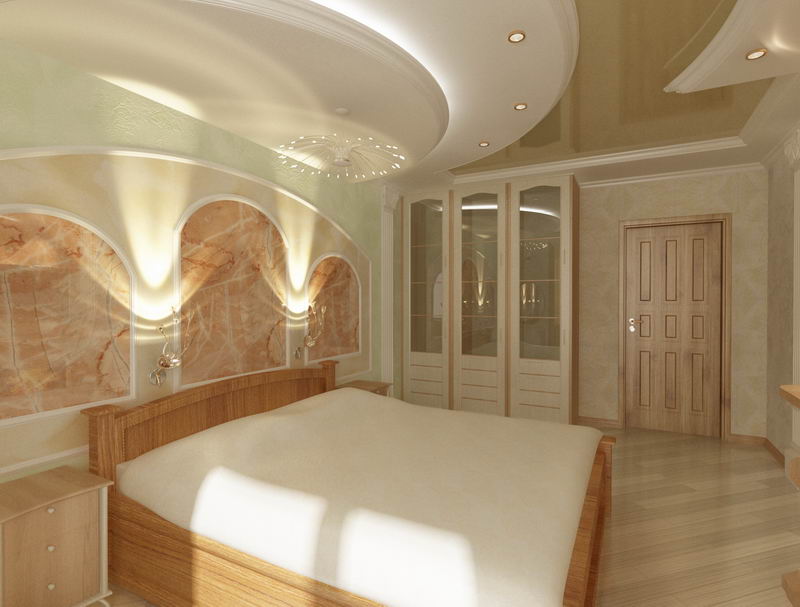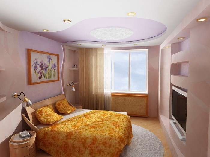 - La chambre Pour créer un plafond figuré dans la chambre, il est préférable de choisir des couleurs pastel, des formes douces et un éclairage tamisé. L'atmosphère romantique créera des motifs délicats ou des lumières vacillantes. Vous ne devez pas installer de lustres volumineux et d’éléments sombres sur les structures de plafond en gypse. La solution idéale pour la chambre à coucher sont des plafonds à l’image d’un ciel étoilé ou de nuagesbien qu'il existe des images sous la forme d'arrangements floraux lumineux.