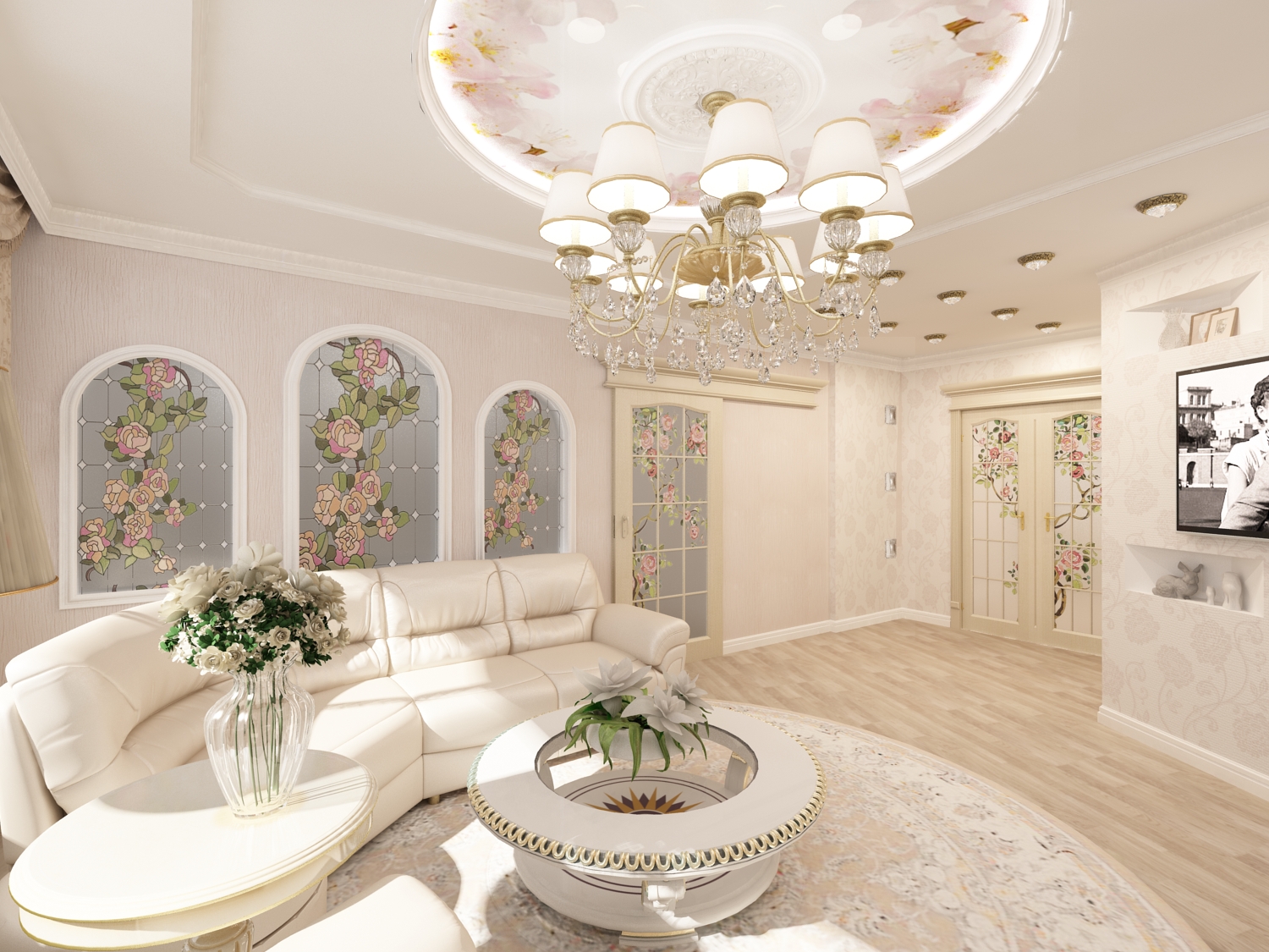 Style classique Il est considéré comme assez moderne, car il combine harmonieusement des formes laconiques et des lignes symétriques. Ici, des figures géométriques, des dessins thématiques, des fleurs ou de beaux motifs sont activement utilisés. La gamme de couleurs de ces plafonds figurés est composée de nuances de blanc, de beige et de café. Pour les constructions de cloisons sèches de ce style, il convient d’utiliser la peinture, ce qui rend la composition globale plus intéressante et plus riche.