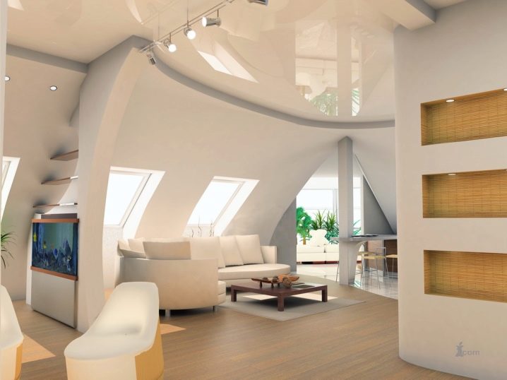 Même la plus petite maison privée ou le plus petit appartement aura un look moderne et extraordinaire, si nous complétons son intérieur par de beaux plafonds bouclés. Un grenier apparemment ordinaire changera sensiblement avec la présence d'une structure de plaque de plâtre incurvée au plafond.