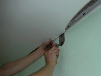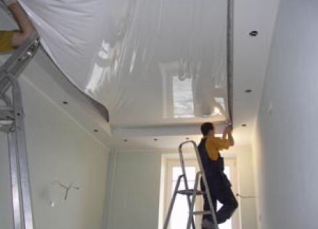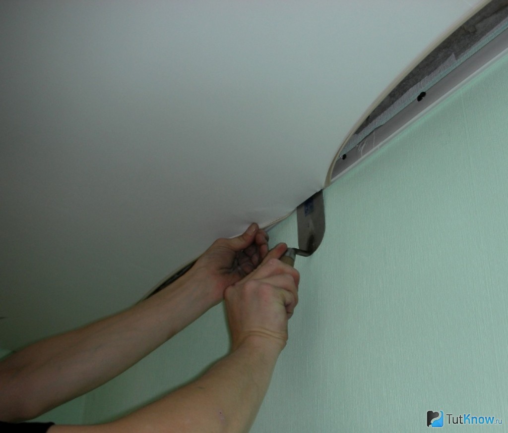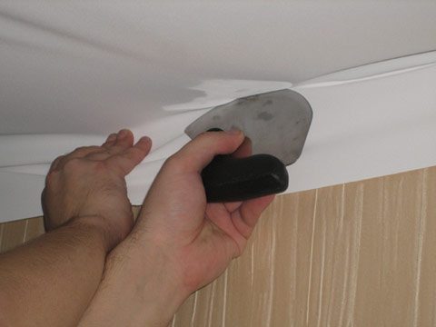 Au quatrième stade, le harpon est monté dans la rainure correspondante à l'aide d'une spatule spéciale. A ce stade, la toile est répartie sous le plafond.Pour l'aligner est chauffé avec un pistolet thermique.