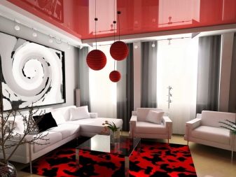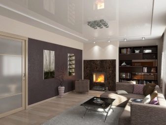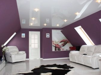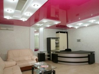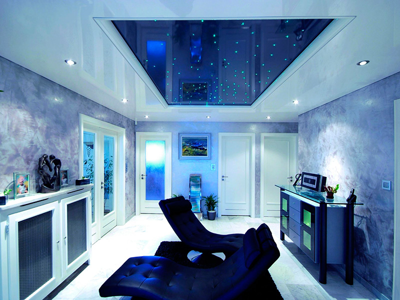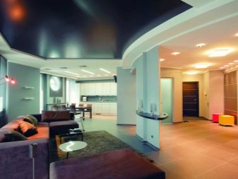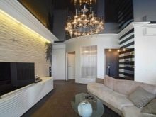 Les plafonds brillants ont pour effet d'augmenter l'espace. En raison de la texture de la surface, ils font plus de place dans laquelle ils sont installés. Cet effet est particulièrement pertinent dans les zones modernes de design d'intérieur, ce qui est important pour montrer la brillance et l'élégance de tout matériau. Si la composition intérieure comporte des éléments brillants, ce revêtement de plafond conviendrait parfaitement.