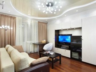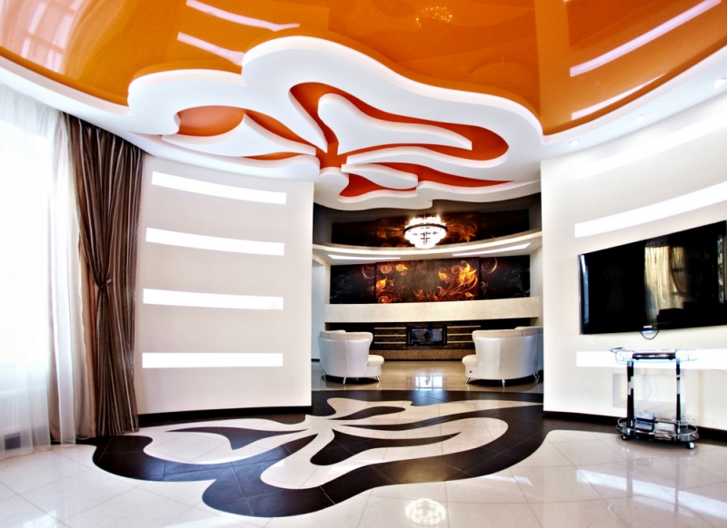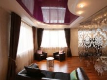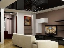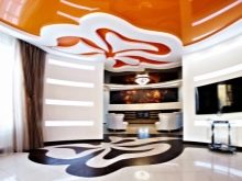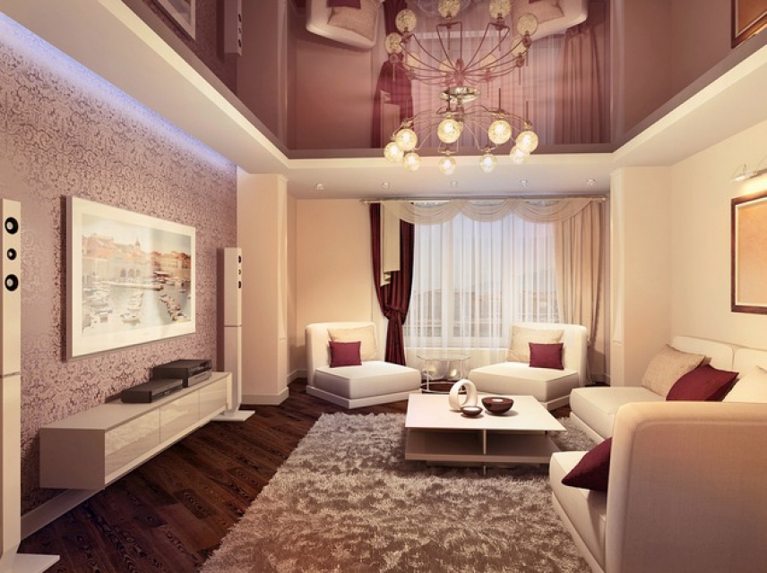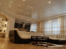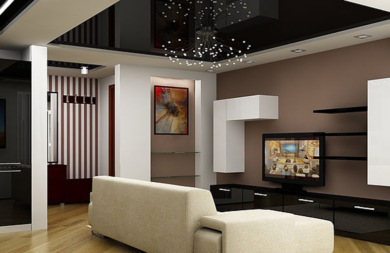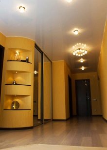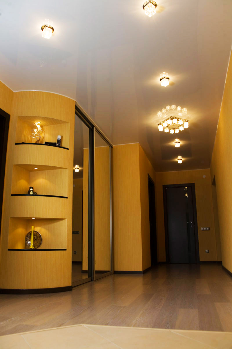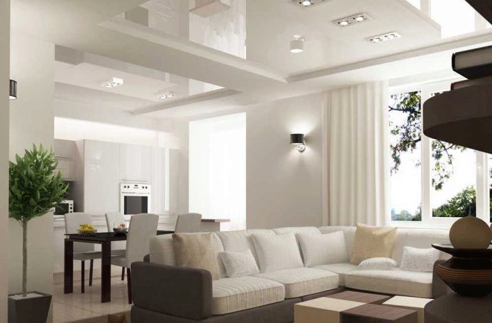 Pour éviter toute perception négative, il convient de réduire le nombre de détails intérieurs.. Cela remplira la pièce d'air et de facilité. L'inclusion partielle de brillant dans la conception du plafond vous permet de créer dans n'importe quelle pièce une organisation discrète, indiquant clairement un espace fonctionnel distinct. Par exemple au moyen de gloss, vous pouvez désigner une salle à manger, mettre en évidence une partie de la zone de cuisson et mettre en valeur le vestiaire dans le couloir. Dans ce cas, il est judicieux de choisir une teinte chaude: des teintes froides et brillantes rendent la pièce inconfortable.