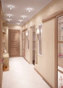 - Dans le couloir, choisissez un plafond blanc brillant sans motif ou une version ivoire, peut-être beige ou pêche blanchie.