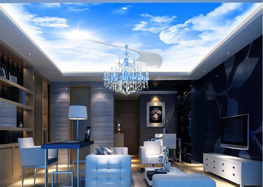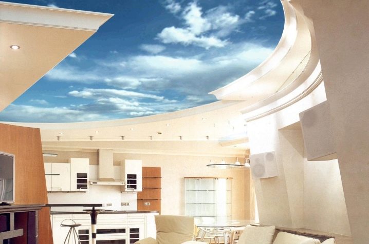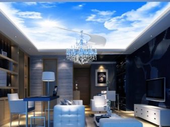Cet exemple montre à quel point le dessin peut être illimité, en supprimant le sentiment de chevauchement. Les tirages photo avec ciel avec éclairage intégré rendent la pièce aérée, volumineuse, créent une attitude positive.
