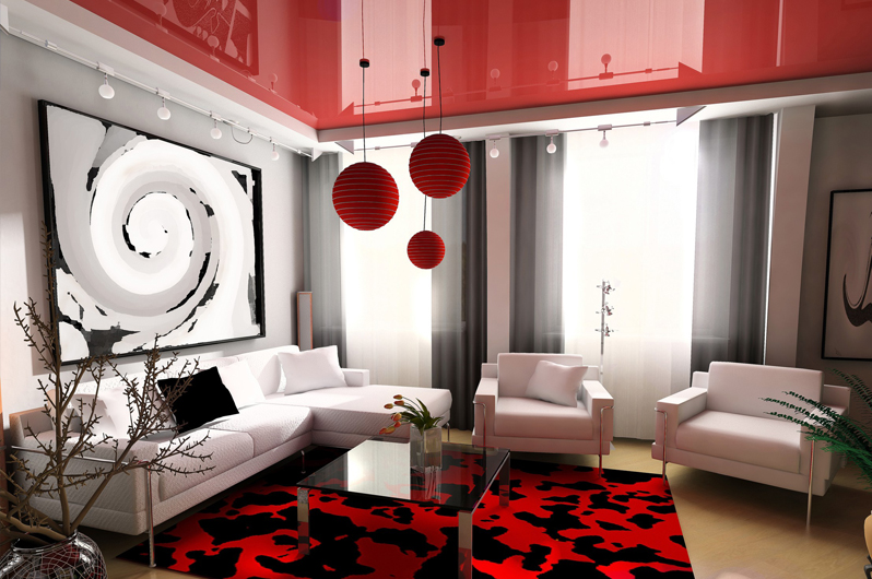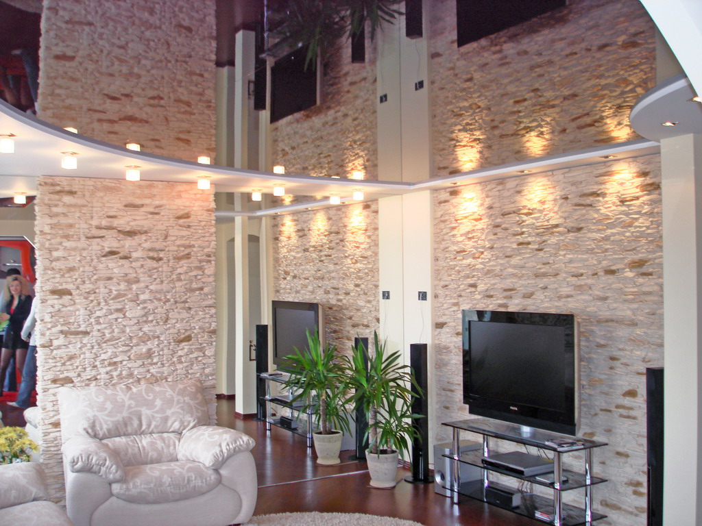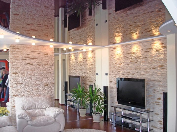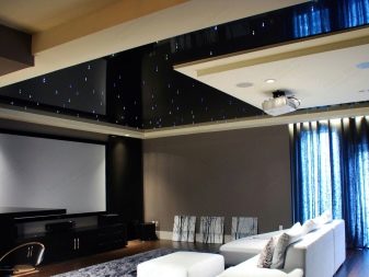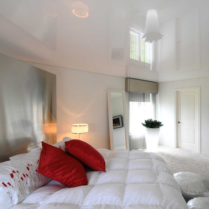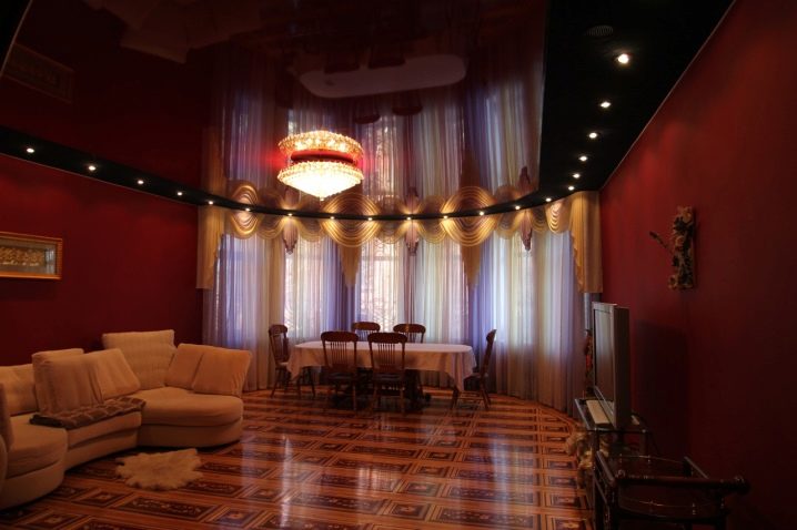 Il convient de noter l'influence de l'effet miroir sur la perception. Un tel plafond a l'air élégant, mais la surface reflète tout ce qui se trouve en dessous. Avec cela plus le ton du matériau choisi est sombre, plus l'effet miroir sera expressif.. Et ici une autre question se pose: le plafond va doubler le nombre de détails de meubles dans une pièce donnée, ce qui est chargé d'effets visuels de confusion et de perte de l'élégance de la structure.