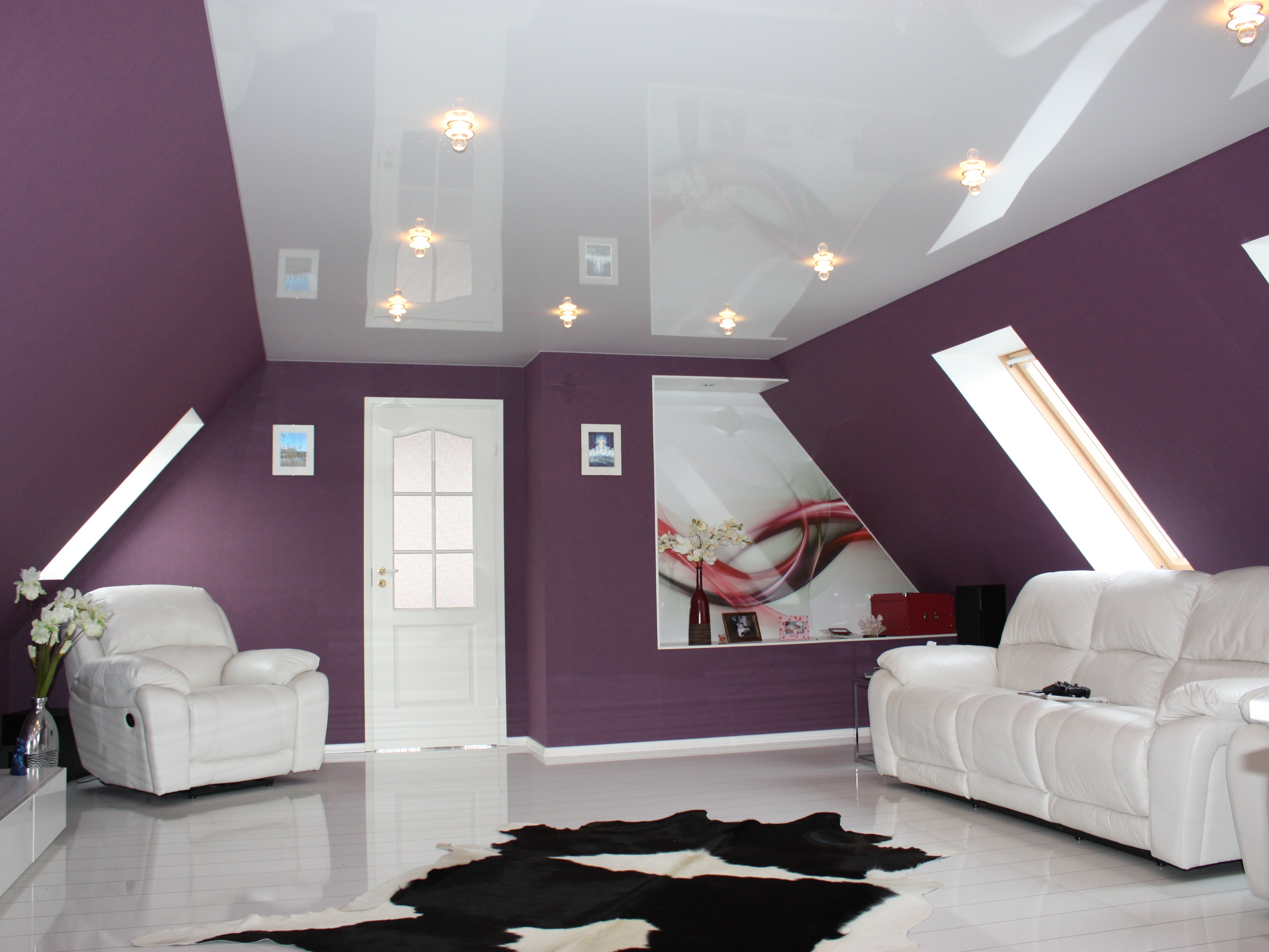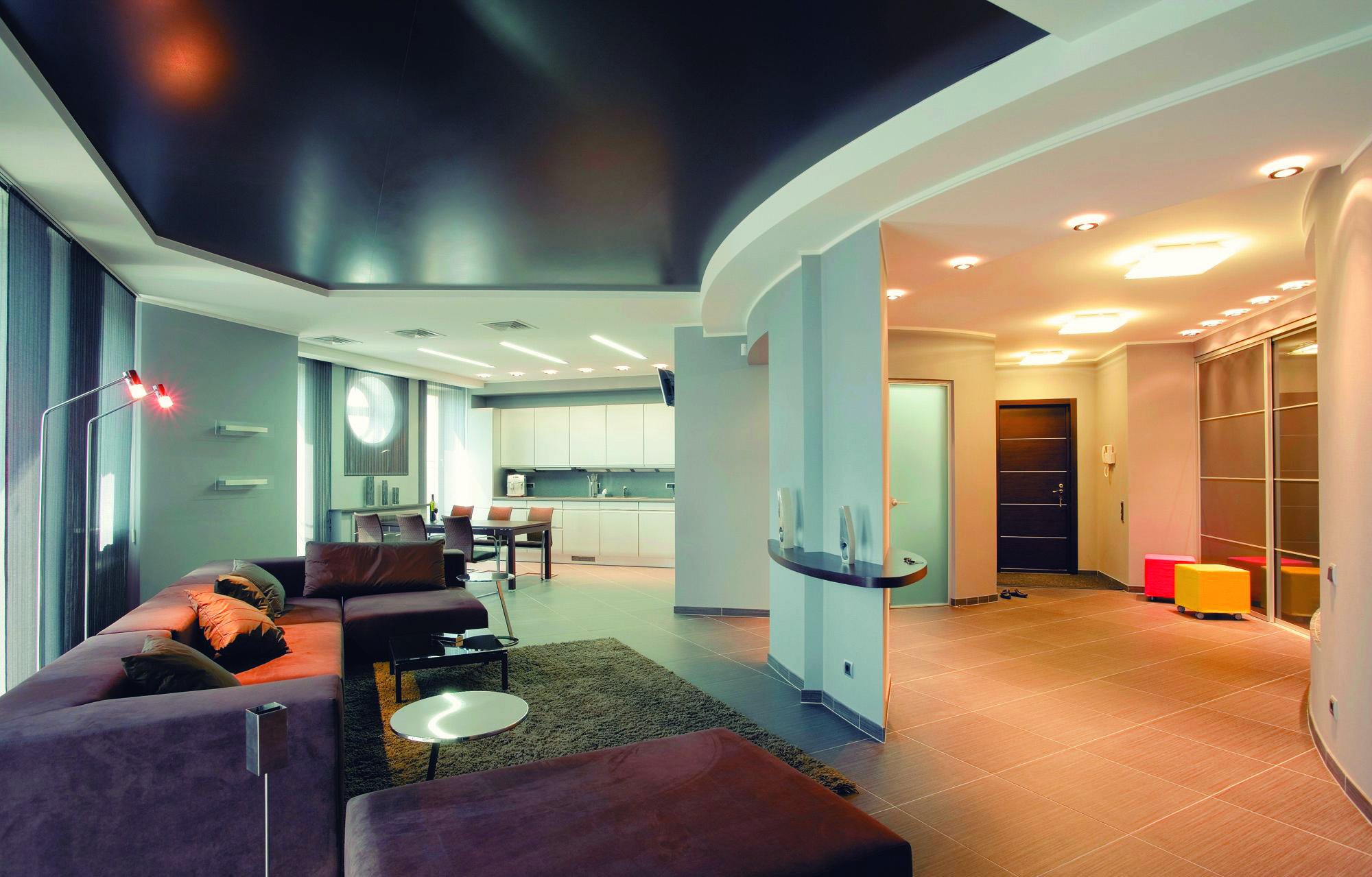 Une des combinaisons de couleurs actuellement à la mode, concrétisée par la conception d’un plafond tendu brillant. Les luminaires suspendus pour chaque zone fonctionnelle créent la bonne atmosphère.