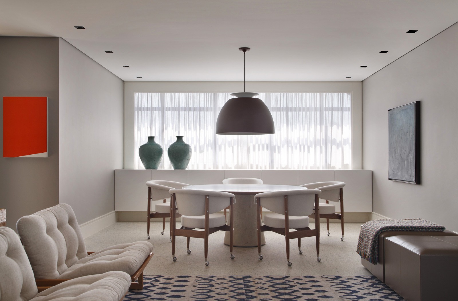 La combinaison de matériaux brillants et de cloisons sèches souligne les zones séparées pour les espaces salle à manger et les espaces invités de la pièce combinée. La couleur blanche adoucit l'effet miroir.