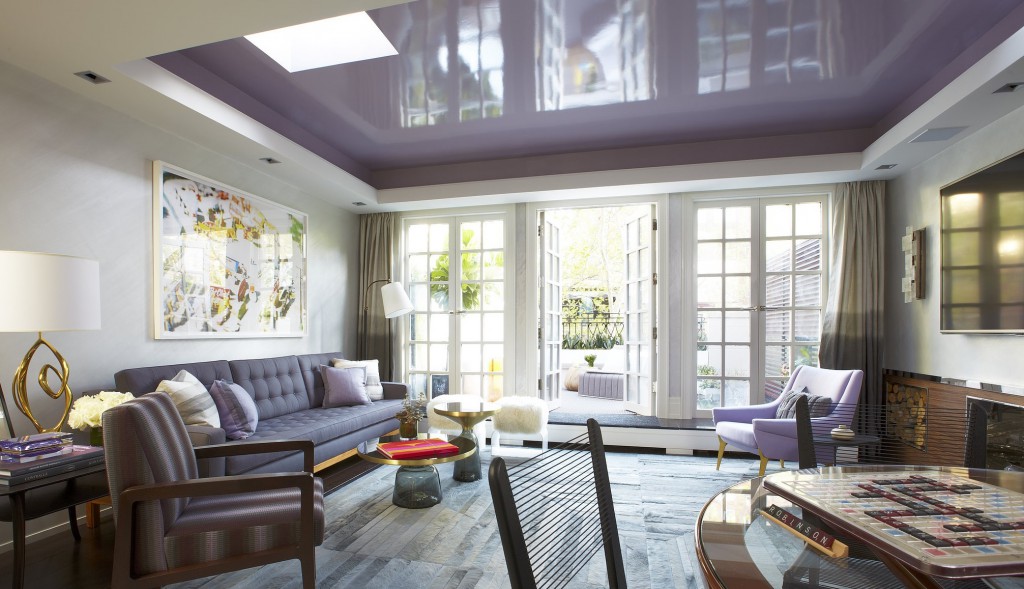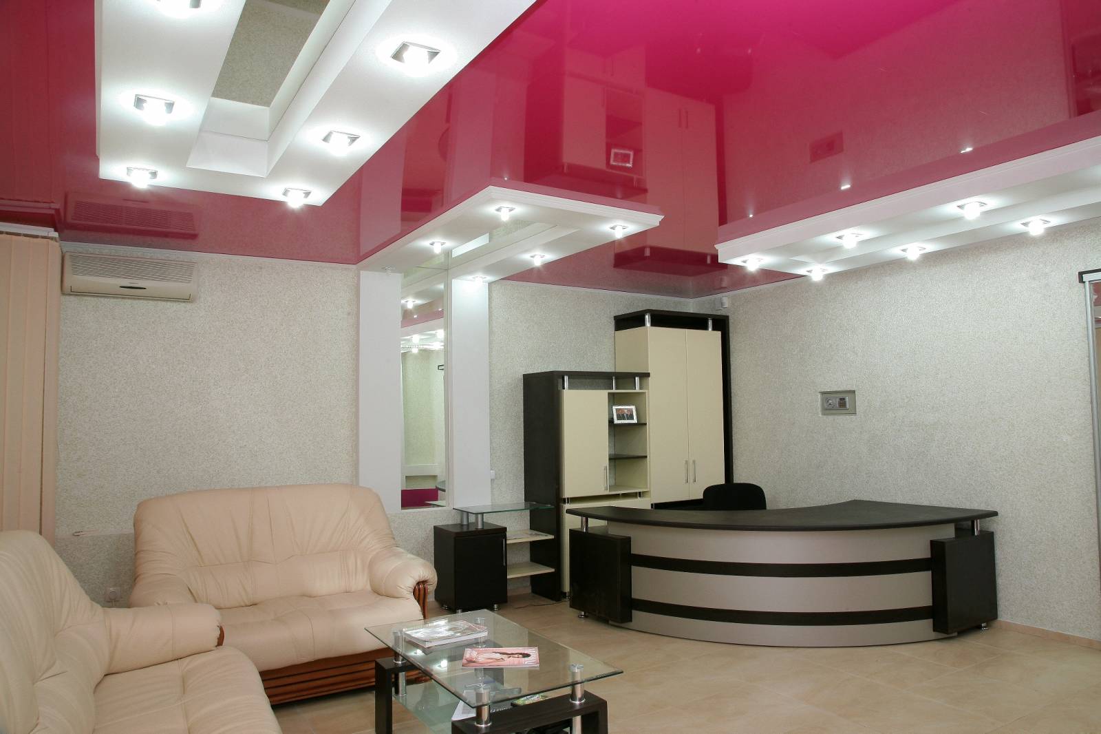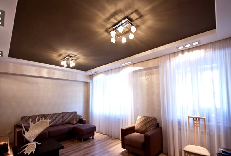 Souvent, dans la construction de plafonds tendus mats et brillants, vous pouvez voir un mélange harmonieux de couleurs, lorsque le design implique l’utilisation de deux nuances délicates.