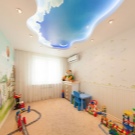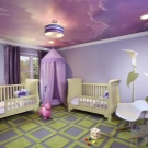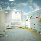 Ici, il est nécessaire de se concentrer sur l'âge de l'enfant. Si le design est fait pour le bébé, vous pouvez choisir une réception stylée, décorant le plafond avec une image du ciel avec le soleil sous la forme d’une lampe centrale. Vous pouvez faire le motif de transition sur le mur. Pour un adolescent, un thème d'espace plus approprié sous la forme d'un petit accent sur un fond blanc. Eh bien, si la composition est similaire à celle du vaisseau spatial.