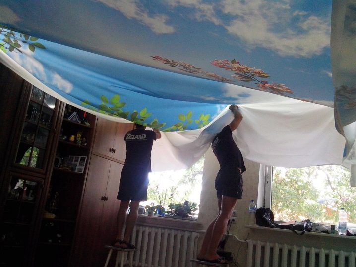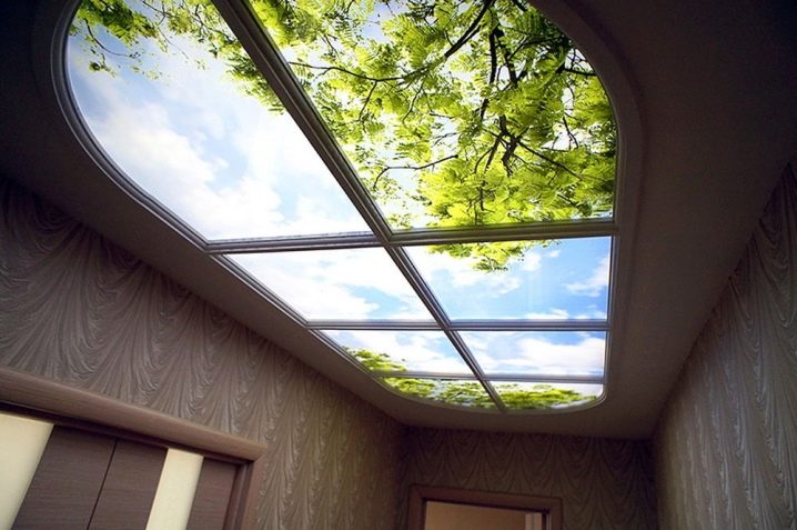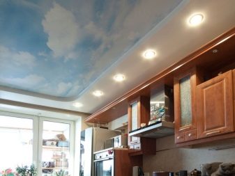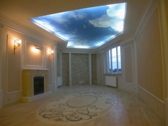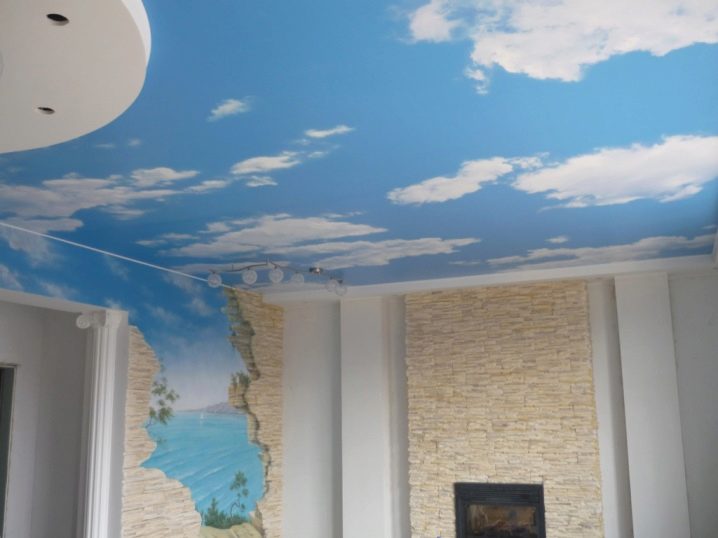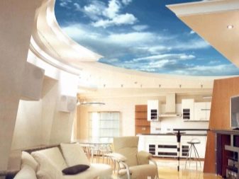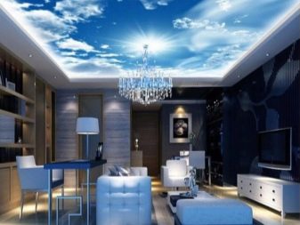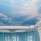 Il est important de remplir l'espace avec de la lumière. La toile doit être réalisée en blanc avec l’insert du motif céleste. Si vous préférez imprimer sur toute la surface du matériau, il est préférable de choisir une teinte bleue avec des nuages blancs. Pour plus de confort, vous devez choisir le flux lumineux de rétroéclairage neutre ou chaud sous forme de diodes.