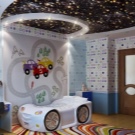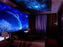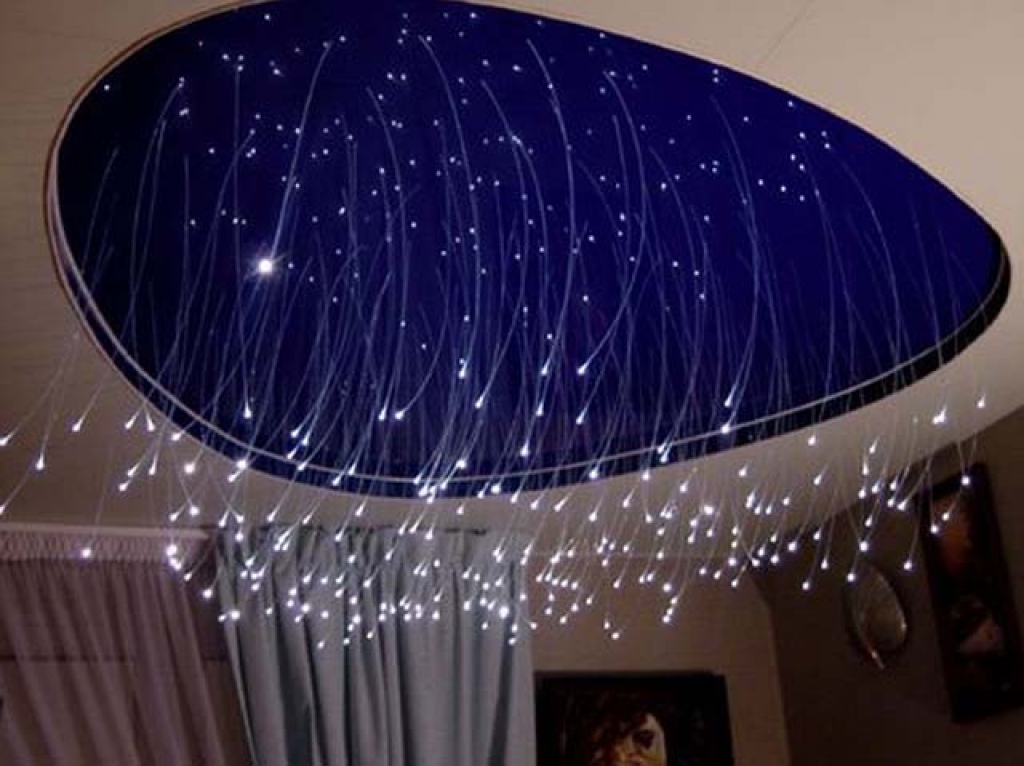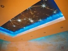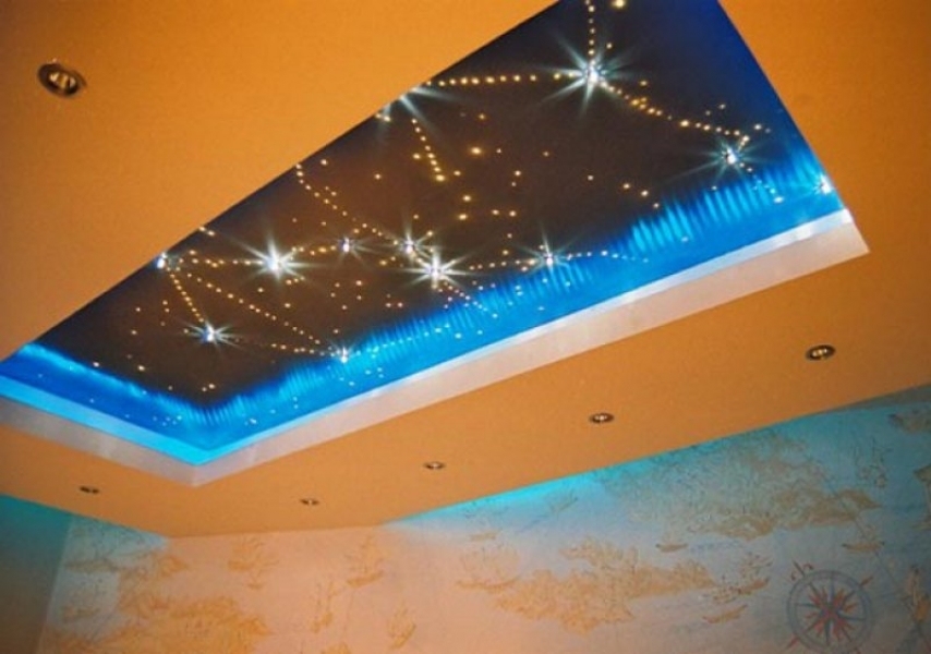 La meilleure solution de conception est une imitation du ciel étoilé.Cette technique vous permet de plonger dans une atmosphère particulière, de ressentir l’unité avec le cosmos. Cette conception est l’une des plus difficiles, bien que chaque chapitre de la famille puisse le faire avec la bonne approche et en suivant les instructions proposées par les artisans professionnels sur Internet. La difficulté réside dans le type d'éclairage composite intégré, qui est conçu en même temps que le design.