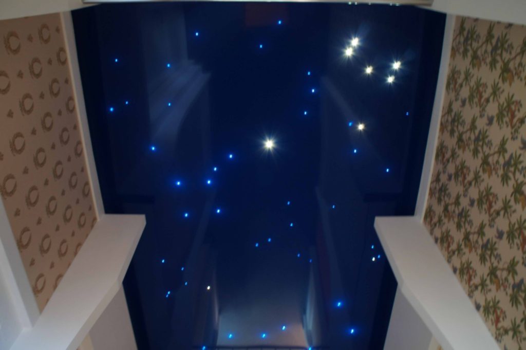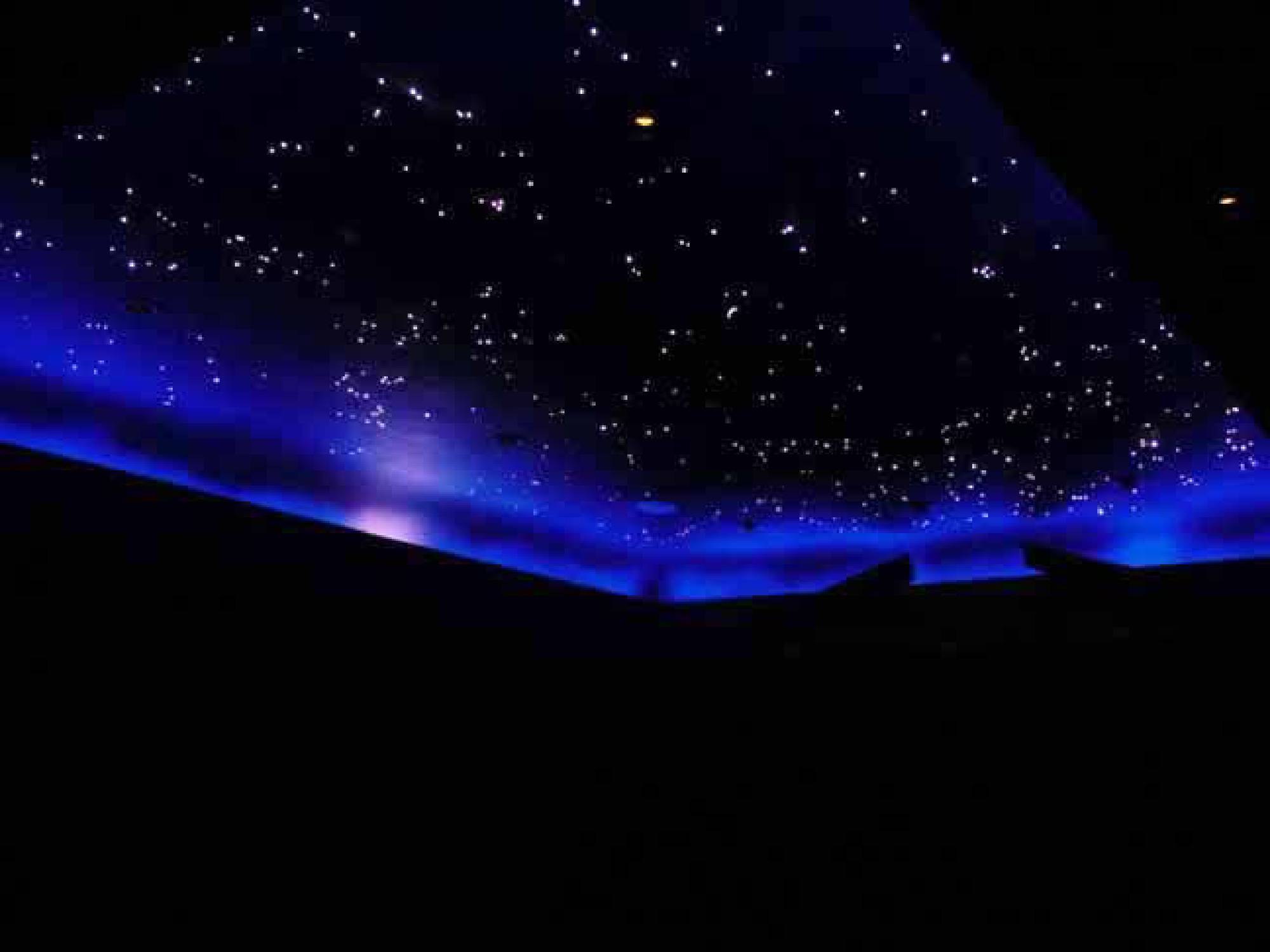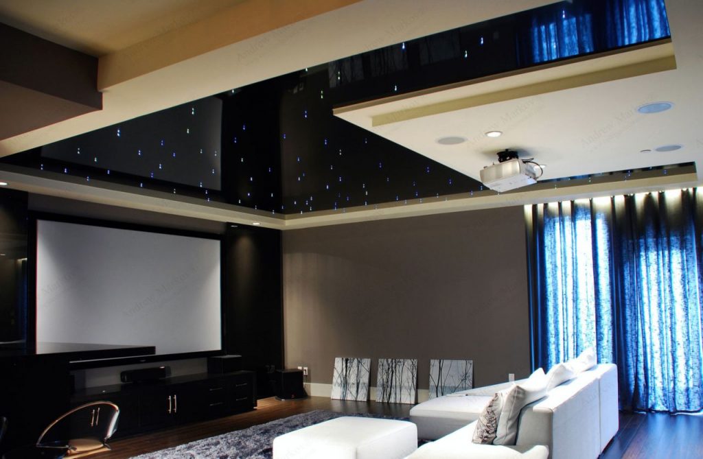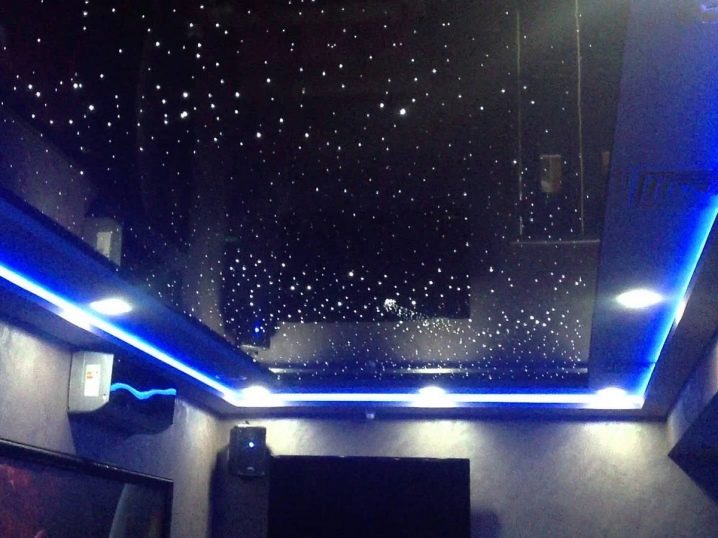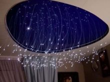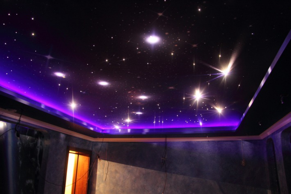 Cette catégorie de structures de tension prend une place de choix parmi les analogues. Pour la fabrication de cette conception en utilisant un tissu textile, qui incorpore un fil de fibre optique, faisant des trous pour les guides de lumière. En mélangeant des fils, en ajoutant des soffites et une bande flexible qui répète tous les contours de la boîte, en utilisant des images de nébuleuses de différentes nuances, vous pouvez donner un effet unique en termes de réalisme.Une solution élégante consiste à monter une bande RVB avec la possibilité de changer la teinte de la lueur, ce qui vous permet de vous plonger dans une atmosphère différente.