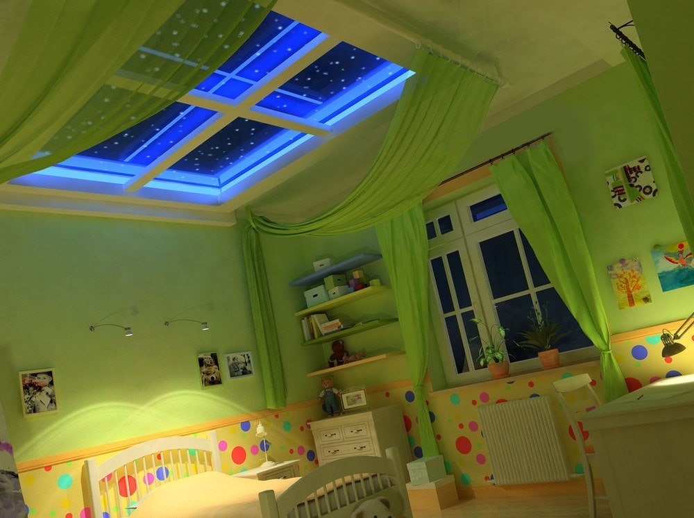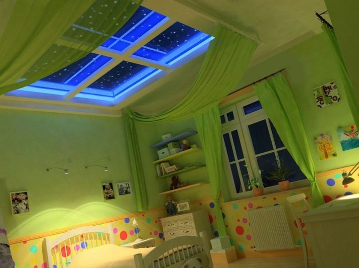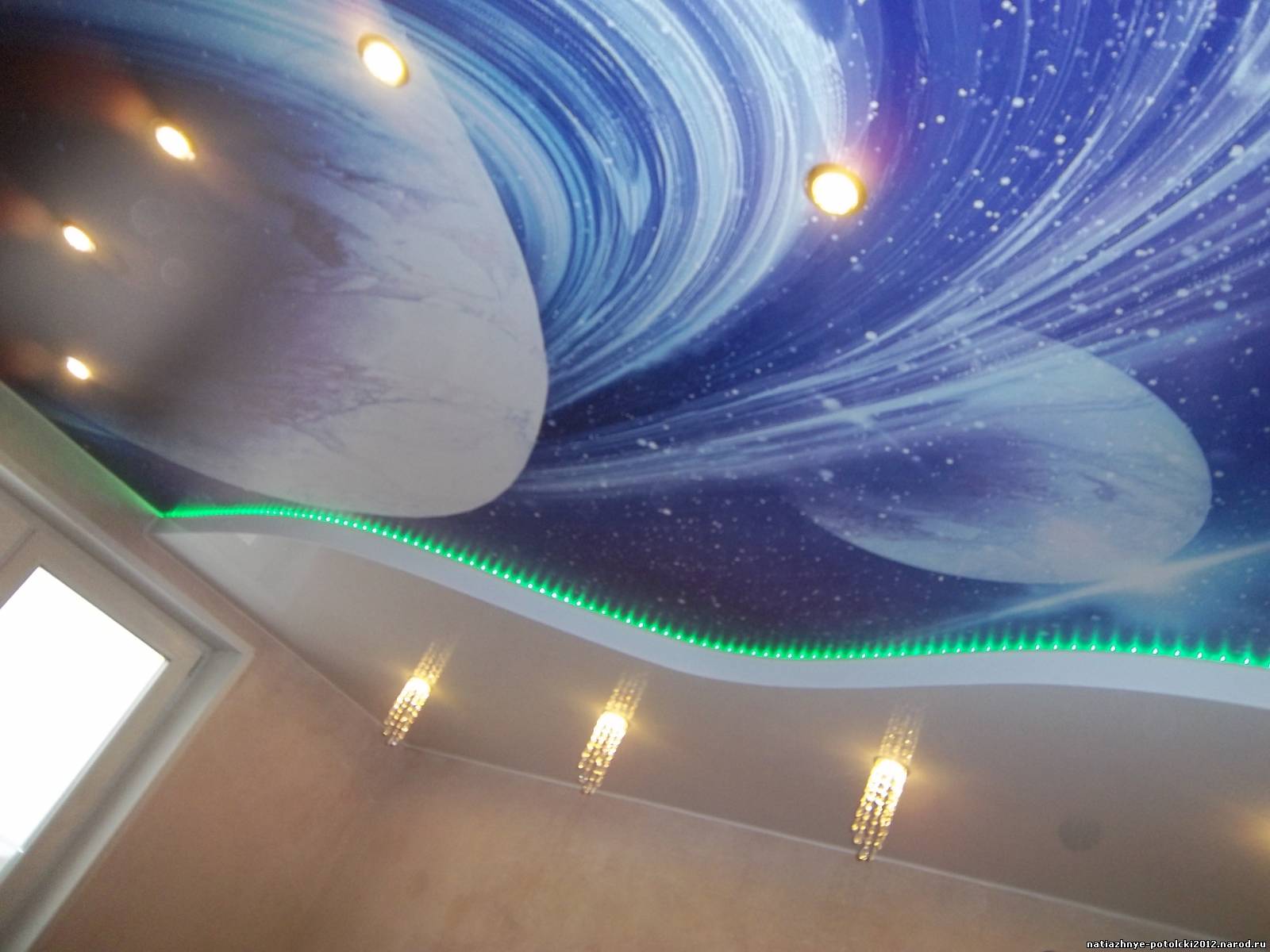 Cette technique a un effet inhabituel et constitue une option économique pour la décoration du plafond. L'effet est obtenu en appliquant une peinture fluorescente par impression photo sur la surface du film. Pendant la journée, un tel plafond a l’air ordinaire, le soir la surface de la toile est transformée: le ciel nocturne avec des étoiles scintillantes apparaît au plafond. Comme les marques de commerce produisent aujourd'hui des colorants inoffensifs pour ces plafonds, ces plafonds peuvent décorer les chambres d'enfants.