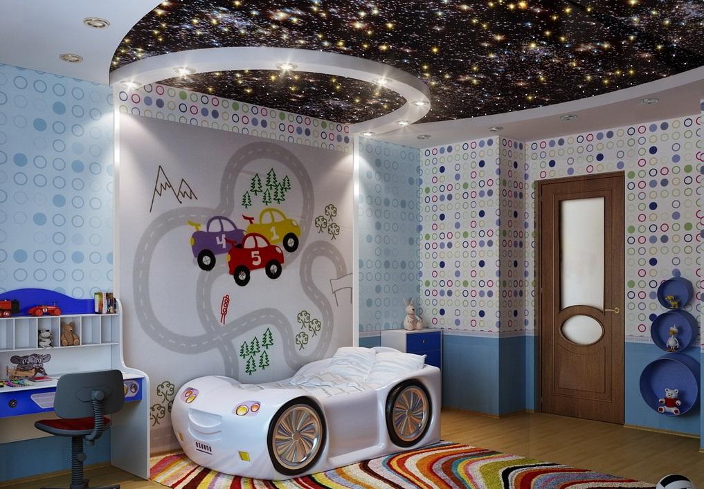 Dans cette pièce, la situation est différente. C'est un lieu de détente. Ici, vous pouvez choisir le thème du ciel nocturne, organiser une réception avec des étoiles scintillantes ou des images de nébuleuses. Si vous ne voulez pas de couleurs sombres, vous pouvez décorer la chambre avec une peinture lumineuse ou choisir un léger accent avec une impression paradisiaque sur le fond d’une structure tendue à deux niveaux.