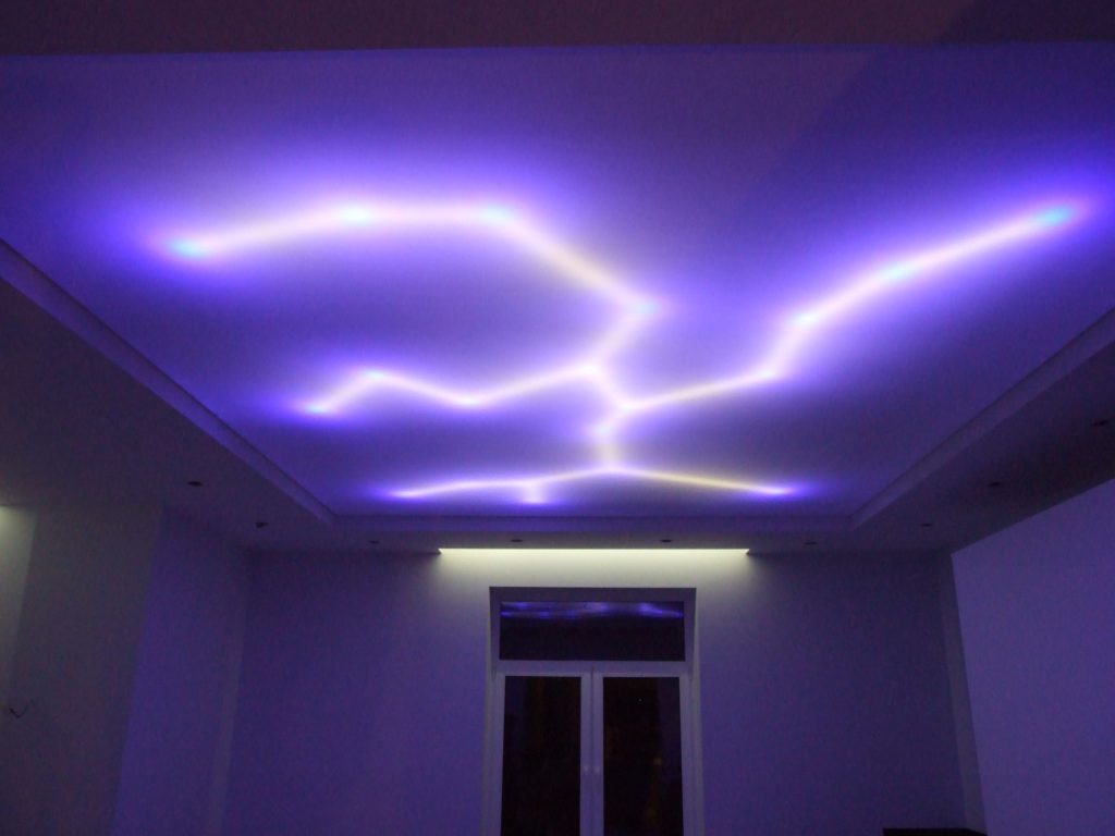 Cette technique implique l’éclairage de la bande sous la forme d’une bande de LED intégrée et de projecteurs individuels. La bande est placée autour du périmètre du tissu, des projecteurs sont placés de manière aléatoire ou autour du périmètre. L'emplacement dépend de l'effet que vous prévoyez d'obtenir. Les projecteurs peuvent être des étoiles ou des projecteurs distincts, ne dépassant pas la surface de la toile de tension.