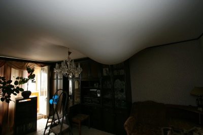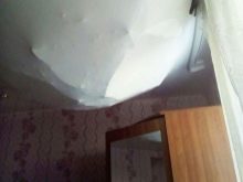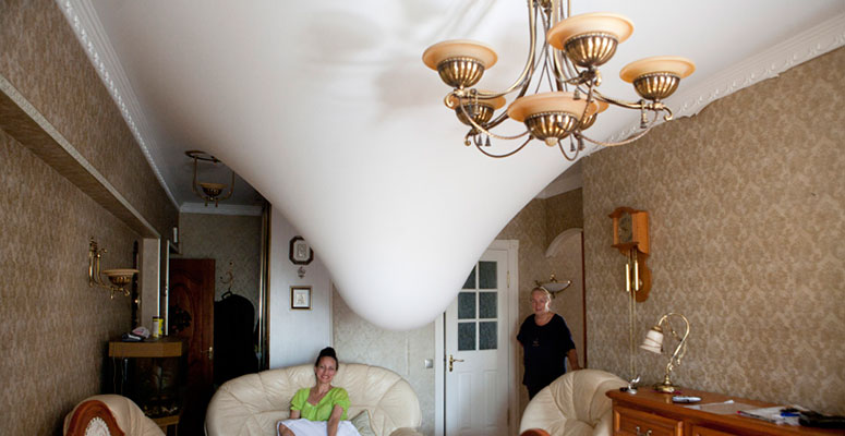 - Inondations d'en haut. Si la hauteur de l'affaissement est importante, la raison en est certainement l'inondation des voisins. Dans cette situation, l'affaissement n'est pas un inconvénient, mais devient son avantage, car la toile ne permettait pas à l'eau d'entrer dans la pièce, ce qui ruinait les meubles et le sol. Si des plafonds de type film transmettant la lumière ont été utilisés, ils reprendront très rapidement leur forme d'origine après avoir drainé l'eau.