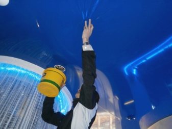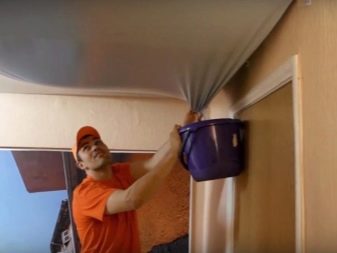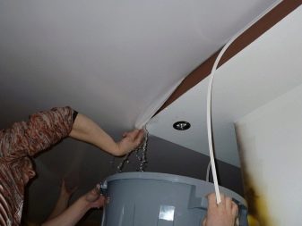 Pour résoudre ce problème, vous avez besoin d'un équipement spécial, avec lequel vous pouvez rapidement drainer l'eau du plafond sans endommager la toile elle-même. Souvent, le volume d'eau concentré dans le plafond est très important et ne peut donc pas être placé dans un seau ou un bassin. De plus, le plafond doit être correctement séché. Si ce n'est pas fait, des taches et des taches resteront à sa surface.