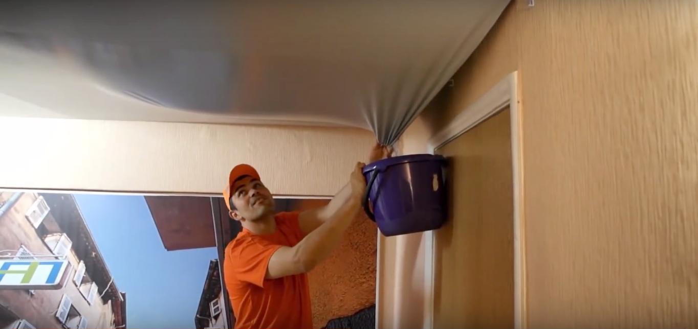 Pour retirer l'eau du plafond tendu, vous avez besoin de 2 personnes. On tirera la toile pour recueillir le liquide dans une section, la transformant en une petite flaque. La seconde à ce moment-là devrait être placée dans cette flaque d’un tuyau de petit diamètre, dont le bout devrait être envoyé au seau. Cela devrait être fait rapidement, ce qui vous permettra de normaliser rapidement le niveau d'humidité dans l'espace d'intercalage. En même temps, en éliminant le problème rapidement, vous réduirez les risques de moisissure et de mildiou.
