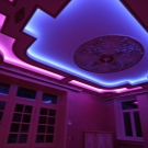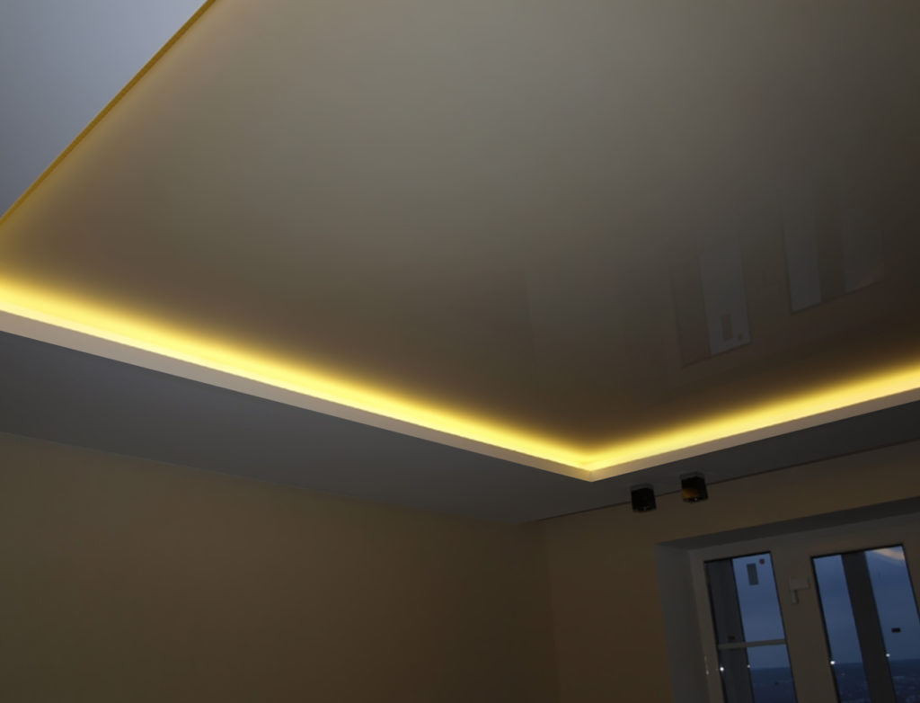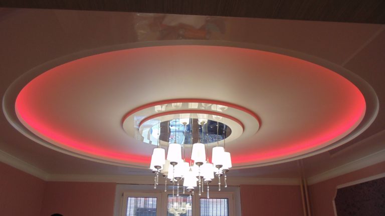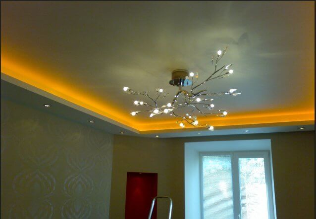 Vous pouvez installer le ruban LED autour du plafond, en le fermant par le bas avec un socle ou une boîte à gypse. Vous obtiendrez des lumières cachées pouvant être cachées dans des niches ou des corniches, en les accentuant et en les mettant en évidence, en zonant la pièce. Vous pouvez également masquer tous les fils d’alimentation dans une boîte à cloisons sèches. En collant les DEL au bord du tissu tendu, vous pouvez obtenir l’effet d’un plafond élevé.