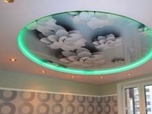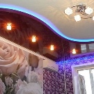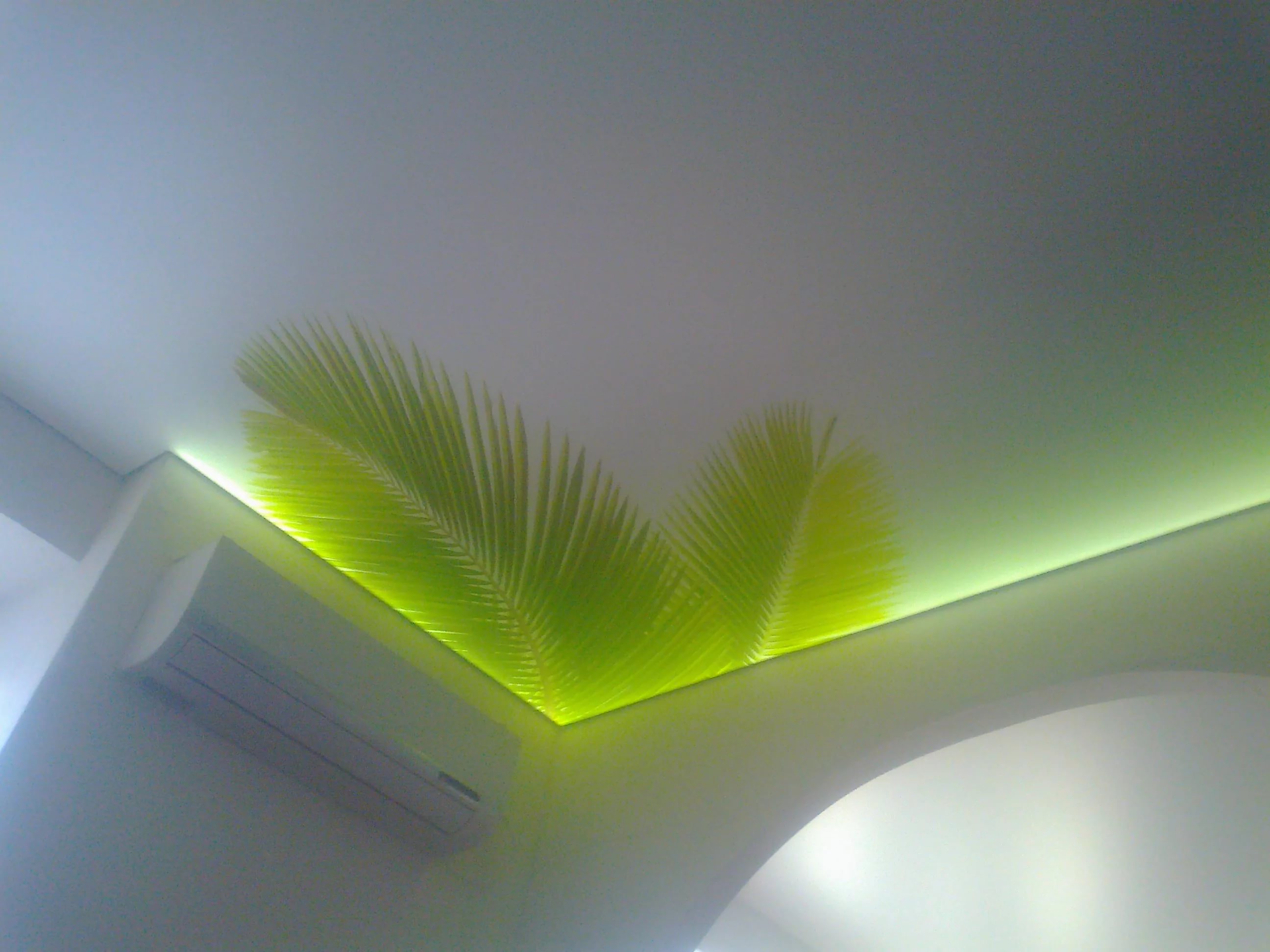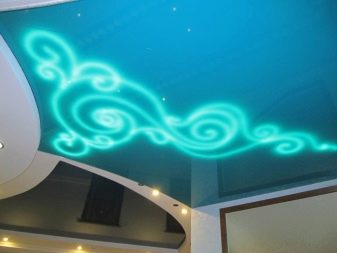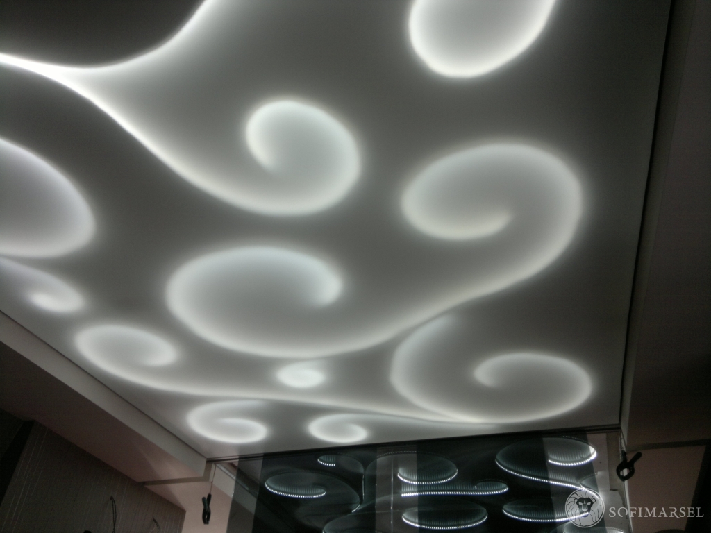 En raison de la translucidité de la toile du plafond, le contour des diodes électroluminescentes placé au-dessus de la surface du plafond brille à travers celle-ci avec une lumière terne et étouffée, dessinant des ornements étonnants sur la tête. Il est nécessaire d'appuyer sur le bouton de l'interrupteur - et la salle est transformée, plongeant dans l'atmosphère de magie et de romance.