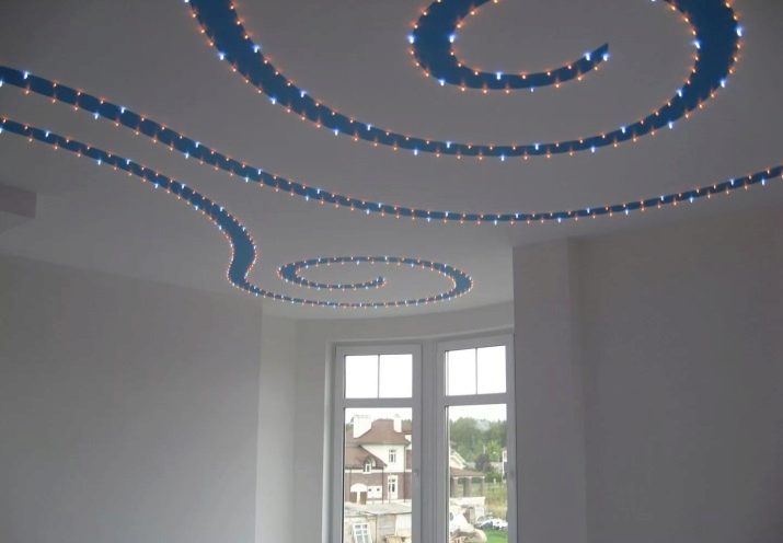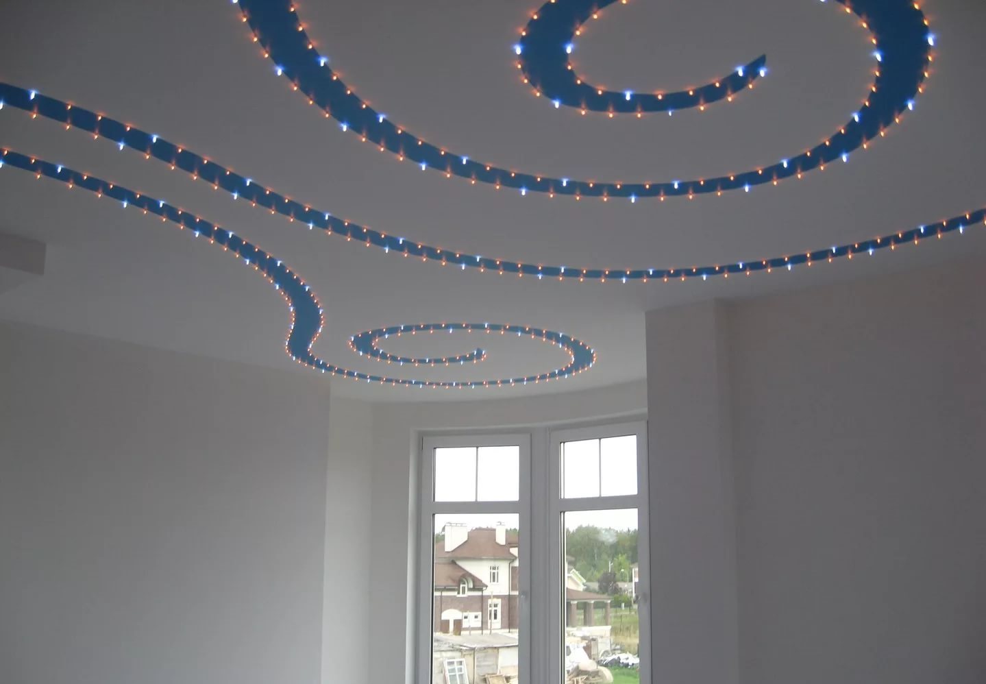 Vous pouvez tracer diverses formes et coller le contour de l'intérieur au plafond. Grâce à la surface translucide, les bandes lumineuses brillent doucement. Dans ce cas, le plafond a l'air magique. Pour couper le ruban, vous devez y trouver des étiquettes spéciales avec des ciseaux. Dans d’autres endroits, il est impossible de couper. Vous pouvez connecter la carte à l'aide de connecteurs. Lors de la mise en page, veuillez noter que le diamètre minimal de la courbure doit être de 2 cm.