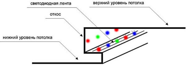 Il existe plusieurs manières d'installer des bandes de LED, grâce auxquelles le même plafond aura une apparence différente. Ces méthodes peuvent être combinées et un éclairage particulièrement impressionnant avec l'attribution de zones sur des plafonds complexes à plusieurs niveaux. Vous devez d’abord tracer un plan du plafond et sélectionner une esquisse de la figure, de la forme et du contour du ruban. Si la longueur du circuit est supérieure à 10 m, il est divisé en deux parties connectées en parallèle.